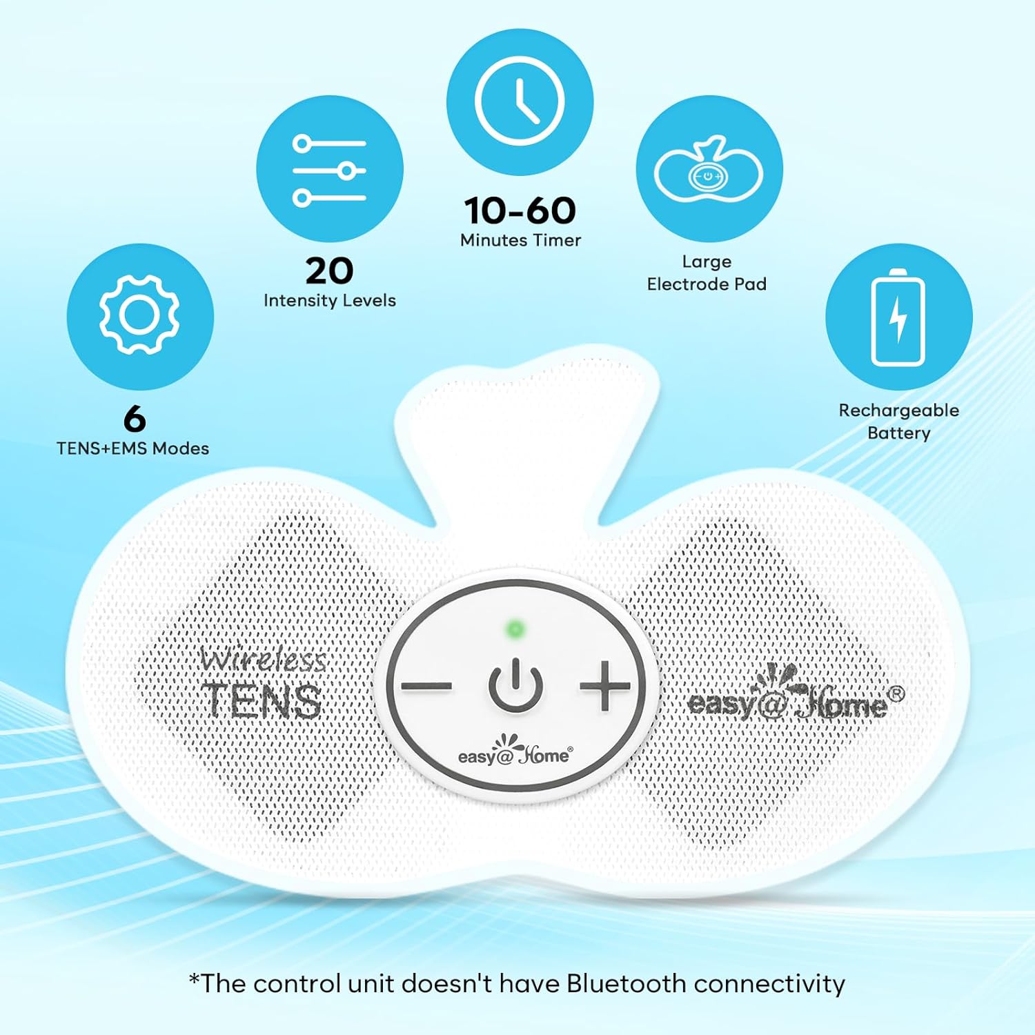 ?? PAIN RELIEF WITH EMS MUSCLE STIMULATION: Natural, drug-free and highly effective Electronic TENS UNIT and for pain relief of joints, back, knees, and more with pulse muscle stimulation effect. Whether chronic pain or sore muscles, EHE015 will suit your needs! 510K cleared for safe home use. An ideal gift for Valentine's Day,Mother's Day,Father's Day,Christmas,Birthday??WIRELESS DESIGN: Design allows users to move freely and is discreet under clothing. No wire and no remote control compact design makes it very easy and convenient to carry and use. Suitable for use home, work, and on-the-go. NOTE: ALIGN simulator snaps and electrode pad holes visually for proper connection before applying to skin. If the pad is not firmly pressed on the skin and you press β+β button to start you will hear 6 beeps and then the unit will auto shut off??PROGRAMMABLE AND EASY CONTROL: 6 Automated Massage Programs and 20 Power Intensity Levels. Only 2-Button control, just turn on by pressing the on/off button and adjust the intensity by pressing β?β or β-β??RECHARGEABLE LONG-LASTING POWER: Rechargeable lithium-ion battery provides long-lasting power to operate for multiple uses; cycles adjustable manually up to 60 minutes.. NOTE: Please CHARGE the unit before first-time use. 20-minute cycle with auto turnoff feature??SAFETY: DO NOT use the product if you have a cardiac pacemaker or an existing cardiac condition, implanted metal devices/screws areas of the body or suffer from epilepsy. Please read the complete safety warnings before purchase. Replacement Pads ASIN:B07L9ZK332