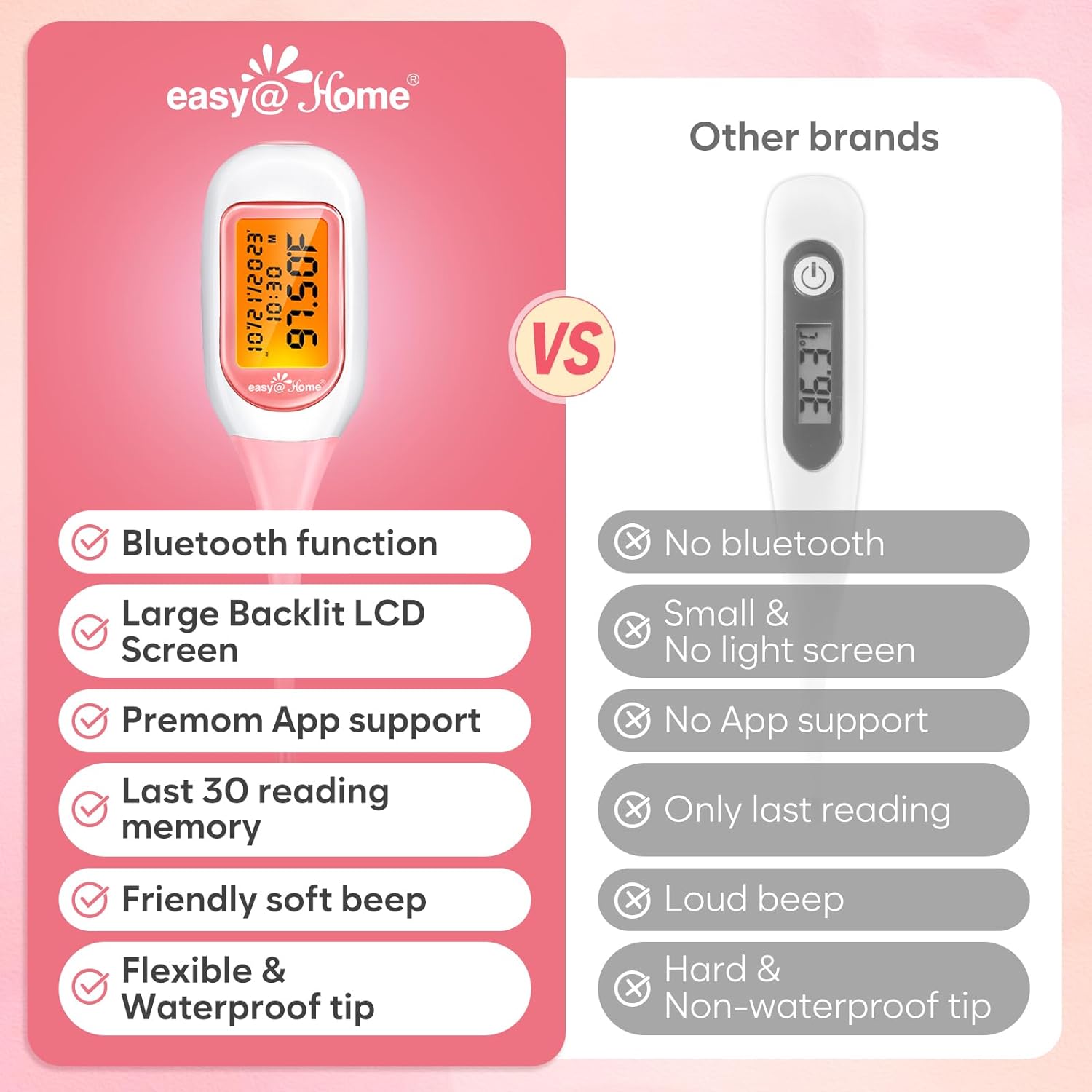 ?"Get Pregnant Easier than ever with Premomā: Easy@Home Newly Launched PremomAPP Integrated Smart Basal Thermometer is the most advanced bluetooth enabled basal thermometer on the market. Whether you are trying to conceive (TTC), avoid pregnancy naturally, or just want to know your body better, the Easy@Homeās Premom with Smart Basal Thermometer does it all with ease?Seamless and Smart: Take a quick measurement early in the morning and fall back asleep. Basal Body Temperature (BBT) will be synced with Premom APP seamlessly. No need to write down temperatures or even open your phone. The Premom APP will chart your BBT and generate the coverline automatically to pinpoint the BBT spike with precision?Intelligent: Premom predicts the fertility window accurately using an advanced algorithm that incorporates all your fertility signs including: BBT, ovulation test results, PdG test results and period information for the best prediction. You can track and view your cycle and fertility windows prediction at any time?Clinically High Measurement Accuracy: Clinically Accurate with high precision at ±0.09/±0.05. It only takes about 1.5 - 2 minutes to read result. Unlimited record stored on cloud with your account. Memory recall up to 30 temperature records. y. Each record shows Date and exact shown track history easily. With its low energy profile, the pre-installed button battery lasts about 3 months. You can choose between Fahrenheit and Celsius?Other Features and Service: Large screen with backlight for reading in the dark. Gentle confirmation beep when test is complete, no timer needed. All your data is stored in the cloud, no concern about manually uploading or losing data. 100 % customer satisfaction guaranteed; experienced customer service agents are available for any questions you may have. **Our Guarantee- We are so confident that you will love this product that we offer a 1 Year Product Quality Guarantee