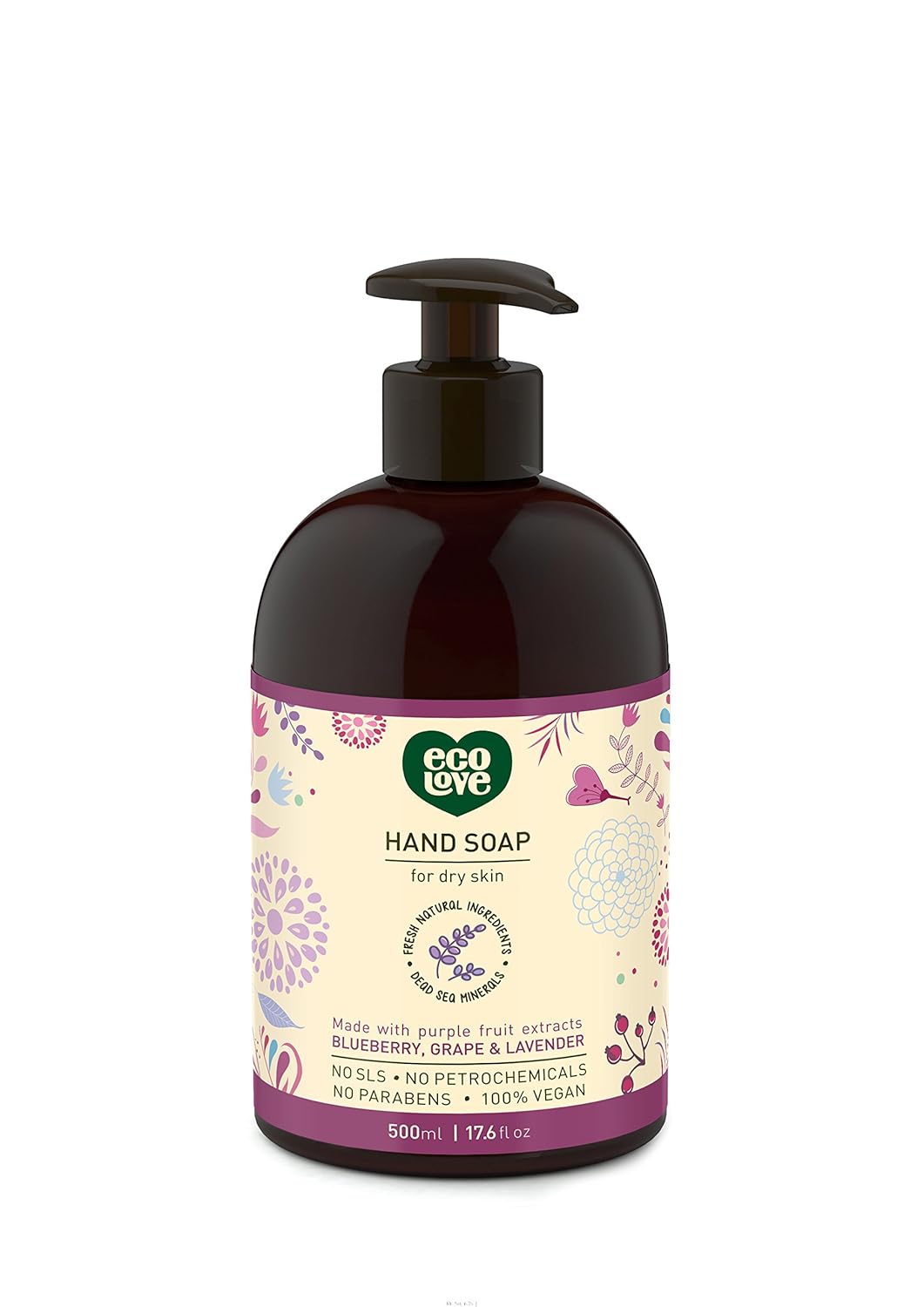 About this item NATURAL & ORGANIC INGREDIENTS: ecoLove Purple Collection Hand Soap is free from SLS, parabens, petrochemicals and alcohol. 95% nature derived ingredients (30% organic). Enriched with natural oils, organic herbs & plant extracts and 26 essential Dead Sea minerals. PERFECT FOR DRY SKIN: Unique blend of organic blueberry, grape and lavender extract hydrates and gently cleanses the skin with a light and relaxing lavender scent. This liquid hand soap is effective in relieving dry, itchy and sensitive skin. Perfect and safe for the whole family. NON-DRYING FORMULA: Moisturizing hand soap effectively cleans hands without drying out the skin, with only one pump needed to clean thoroughly. Leaves skin feeling smooth, soft and clean. VEGAN & CRUELTY FREE: 100% certified vegan and eco-friendly. ecoLove hand soaps are not tested on animals. OUR STORY: ecoLove is committed to creating the best body care products for you and your family while combining a love and respect for nature. Organic vegetable fields were our inspiration, while the need for excellent skin-friendly hair & body products were our motivation. See more product details,NATURAL & ORGANIC INGREDIENTS: ecoLove Purple Collection Hand Soap is free from SLS, parabens, petrochemicals and alcohol. 95% nature derived ingredients (30% organic). Enriched with natural oils, organic herbs & plant extracts and 26 essential Dead Sea minerals,PERFECT FOR DRY SKIN: Unique blend of organic blueberry, grape and lavender extract hydrates and gently cleanses the skin with a light and relaxing lavender scent. This liquid hand soap is effective in relieving dry, itchy and sensitive skin. Perfect and safe for the whole family,NON-DRYING FORMULA: Moisturizing hand soap effectively cleans hands without drying out the skin, with only one pump needed to clean thoroughly. Leaves skin feeling smooth, soft and clean,VEGAN & CRUELTY FREE: 100% certified vegan and eco-friendly. ecoLove hand soaps are not tested on animals,OUR STORY: ecoLove is committed to creating the best body care products for you and your family while combining a love and respect for nature. Organic vegetable fields were our inspiration, while the need for excellent skin-friendly hair & body products were our motivation