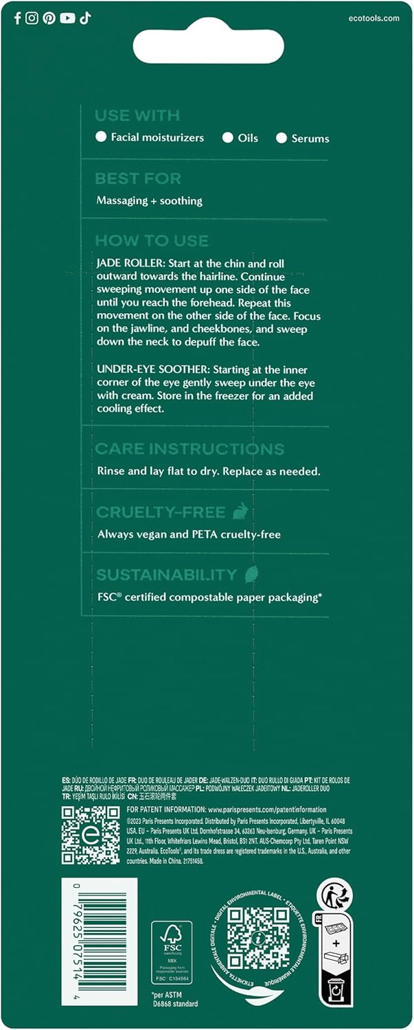 The EcoTools Jade Roller Duo is made with our specialty sourced Jade and designed to help reduce puffiness and smooth the skin. Start at the chin and roll outward towards the hairline to secure the firmness of the skin. Continue this movement throughout the rest of the face and neck area for tightness. Use the larger end of the roller for the cheeks and forehead and the smaller end for the under the eyes and around the nose. After each use, rinse thoroughly and air dry. The EcoTools Jade Facial Roller and Eye Roller is a total skincare essential. This duo is one of a kind by targeting areas on the skin to leave you looking and feeling younger. While continuing our signature eco-friendly array of makeup, skincare, and bath care. From the moment you wake up to the minute to go to sleep, there is always an EcoTool for you. EcoTools believes in taking the guesswork out of sustainability by making quality, eco-conscious personal care products accessible to everyone. We aim to create high performing, consciously crafted products that work for you, the planet, and your wallet. From exceptional makeup brushes and sponges to eco-friendly bath brushes and accessories, our products are not only sustainable and effective, but they are also always 100% vegan and cruelty-free,The EcoTools Jade Facial Roller and Eye Roller may help promote circulation and reduce inflammation,Includes: (1) Jade Facial Roller and (1) Eye Roller,Helps improve skin elasticity and tightens skin for a firmer and more youthful appearance,Pair with your favorite serums, oils, and moisturizers to give your skin a luminous glow!,Store in the refrigerator to help de-puff or run under warm water to help pores,Fits into all the contours of your face to firm, massage, and lift,Easy to use on the face, chin, and jawline,Helps promote drainage and penetrates skincare products underneath the surface,100% Cruelty Free and Vegan - EcoTools products are never tested on animals,Made with recycled materials - EcoTools believes in reducing waste by using recycled aluminum and plastic in our products