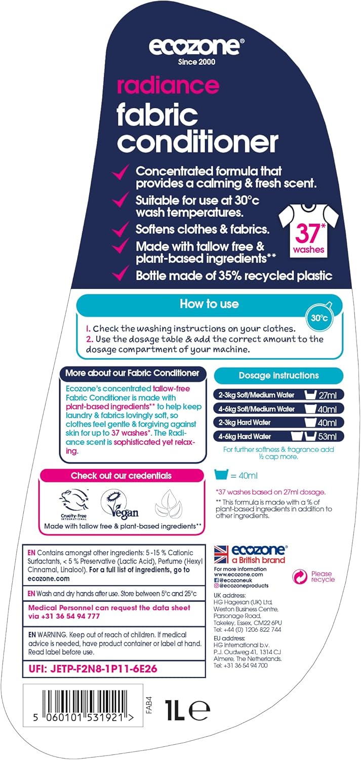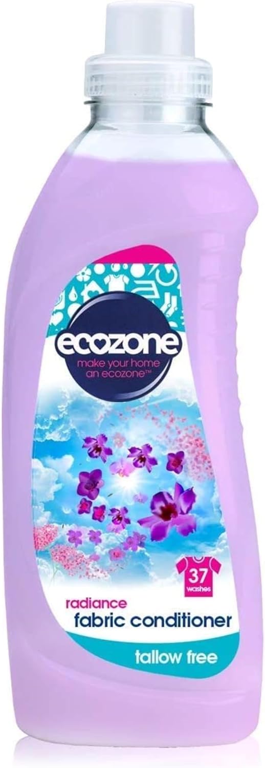 About this item Ecozone Radiance Fabric Conditioner: A highly concentrated fabric softener with a gentle yet uplifting perfume. Contains natural plant extracts to keep your laundry lovingly soft, enough for 37 washes Mild and gently fragranced: Concentrated for long-lasting freshness, with a sophisticated yet relaxing scent which lasts and lasts. Ideal for bedding, towels, jeans, tops & uniforms for all the family Cruelty free, gentle vegan-friendly formula: Approved by PETA and not tested on animals. Contains no animal products. Approved by Allergy UK to be allergy friendly and safe for sensitive skin The power of plants: The pure, natural ingredients keep textile fibres smoother, so clothes feel gentle and forgiving against your skin. Safe to use on delicates; pet and child friendly A smart green clean with Ecozone: Created by families for families. Environmentally friendly cleaning products that work, inspired by plant-based, natural ingredients with no nasty hidden chemicals › See more product details,Ecozone Radiance Fabric Conditioner: A highly concentrated fabric softener with a gentle yet uplifting perfume. Contains natural plant extracts to keep your laundry lovingly soft, enough for 37 washes,Mild and gently fragranced: Concentrated for long-lasting freshness, with a sophisticated yet relaxing scent which lasts and lasts. Ideal for bedding, towels, jeans, tops & uniforms for all the family,Cruelty free, gentle vegan-friendly formula: Approved by PETA and not tested on animals. Contains no animal products. Approved by Allergy UK to be allergy friendly and safe for sensitive skin,The power of plants: The pure, natural ingredients keep textile fibres smoother, so clothes feel gentle and forgiving against your skin. Safe to use on delicates; pet and child friendly,A smart green clean with Ecozone: Created by families for families. Environmentally friendly cleaning products that work, inspired by plant-based, natural ingredients with no nasty hidden chemicals
