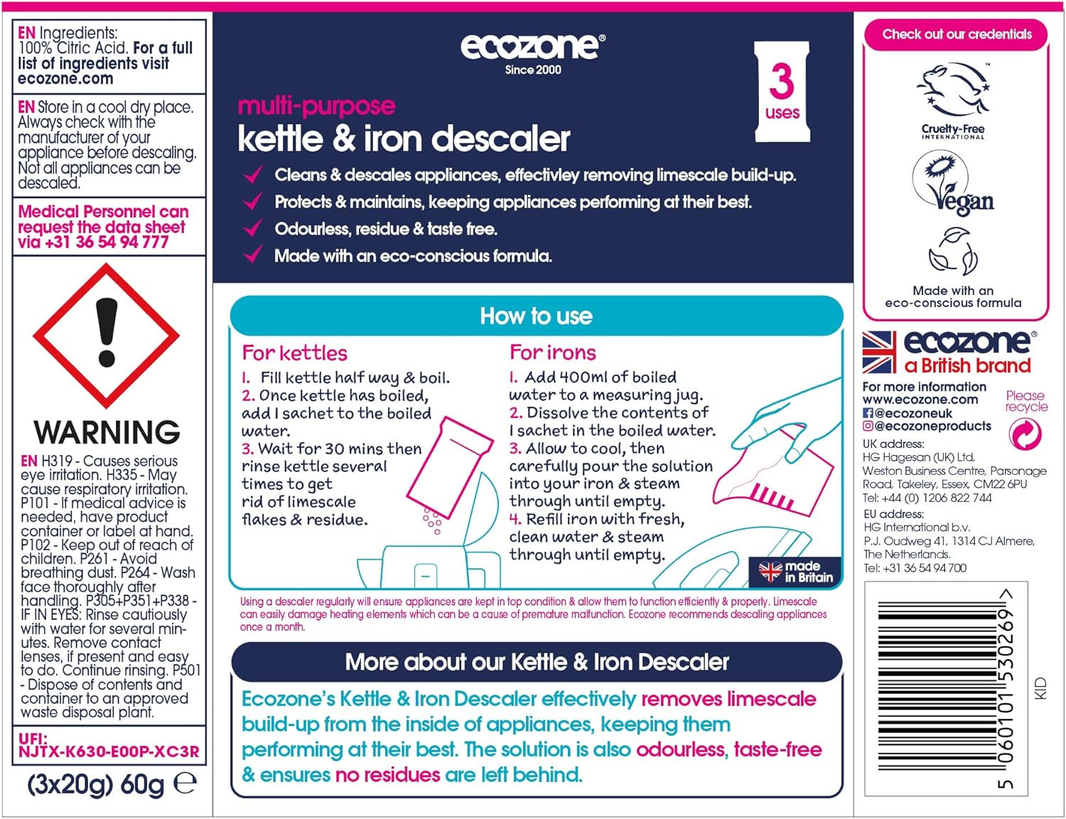 Product Description Ecozoneās Kettle & Iron Descaler is a great overall, fast-acting product to effectively rid limescale from key electrical appliances in your home. Its eco conscious and non-toxic cleaning formula is designed to work with all machine brands and makes. The scale remover and limescale prevention solution works effectively to remove lime deposits from the inside of your ironing and hot drink making appliances. Using a descaler regularly will ensure they are kept in top condition and allow them to function properly. Limescale can easily damage heating elements which can be a cause of premature malfunction. This natural, multi-use formula comes in three sachets, allowing for multiple uses. Just add a sachet of powder to boiling water. The solution is also odourless and taste free, and ensures that no residues are left behind. It works fast and is gentle on appliancesā internal parts and materials. Always check with manufacturer/ownerās manual before descaling an electrical appliance. ⢠Ecozone Kettle & Iron Descaler ā 3 sachets ⢠Easy to use, internal limescale & scale deposit remover ⢠Fast acting formula that descales in minutes ⢠Sanitises & breaks down lime build-up thatās accumulated over time ⢠Prolongs appliance performance & life-time ⢠Gentle on skin & appliances ⢠Biodegradable & natural formula ⢠Non-toxic powdered, multi-use solution ⢠Septic tank safe ⢠Strong & powerful yet wonāt damage internal mechanisms ⢠Eco friendly plant-based formula, made using natural ingredients ⢠Vegan friendly ⢠Not tested on animals ⢠Allergy friendly Directions: Kettle ā 1.Boil kettle 2.Empty contents of 1 sachet into the kettle 3. Wait 30 minutes . 4.Rinse. Irons ā 1. Dissolve contents of one sachet in 400ml of hot water. 2.Heat your iron. 3. Add solutions and steam until empty. 4. Re-fill with fresh water and steam until empty. Ingredients: Citric Acid. Ingredients Citric Acid P.when('A').execute(function(A) { A.on('a:expander:toggle_description:toggle:collapse', function(data) { window.scroll(0, data.expander.$expander[0].offsetTop-100); }); }); Directions For kettles: 1. Half fill your kettle and boil. 2. Unplug it when itās finished. 3. Pour the contents of one sachet into your kettle and leave for 30 minutes. 4. Rinse thoroughly and make a cup of tea, you deserve it. Kettles that are heavily scaled may need another go. For irons: 1. Heat your iron up and when itās hot, unplug it. 2. Mix the contents of one sachet with enough hot water to half fill your iron, and pour it in. 3. Hold your iron over the sink and switch on steam until all the contents have steamed out. 4. Refill with fresh water and flush through until all the residueās gone - you can check this by ironing an old piece of fabric. Wait a minute! Before you start, check that descaling is recommended by the manufacturer. Safety Warning Keep out of reach of children. In case of contact with eyes, rinse immediately with plenty of water and seek medical advice. After contact with skin, wash immediately with plenty of water. If swallowed, seek medical advice immediately and and show this container. Manufacturer's Description EcozoneĀ® Kettle & Iron Descaler has been specially formulated to effectively remove limescale deposits without toxic chemicals. By descaling regularly, your appliances will be limescale free, work more effectively and could reduce your electricity bills. Offering three applications in each pack, Kettle & Iron Descaler is an economical and eco-friendly way to keep your appliances clean and working efficiently. Suitable for both Kettles and Irons, our formula will leave your appliances pristine, helping them to function better and prevent the problems associated with limescale build-up. Box Contains 3x Sachets of Kettle & Iron Descaler See more,Removes limescale build up effectively,Could save on energy costs,Helps your appliances last longer,economical and eco-friendly way to keep your appliances working for longer,Suitable for both Kettles and Irons, our formula will leave your appliances pristine, helping them to function better and prevent the problems associated with limescale buildup
