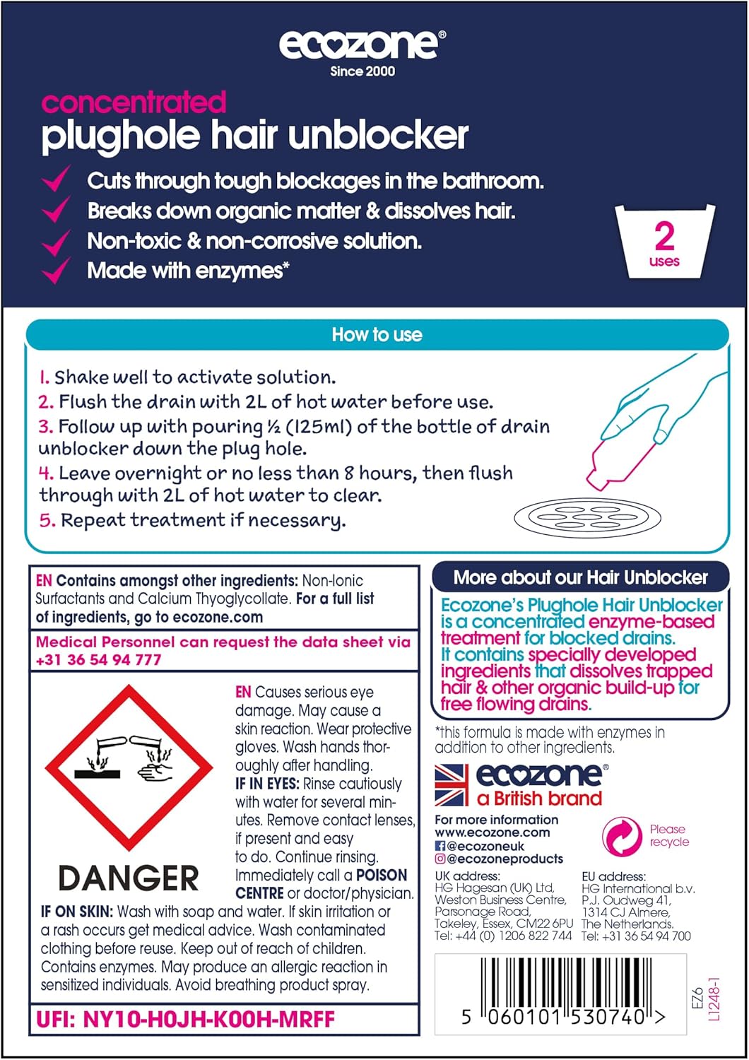 Product Description EcoZone’s ultra-effective Kitchen Drain Unblocker is an enzyme based treatment for blocked drains. Containing specially developed ingredients that slowly eat away through tough blockages, the clever plug hole unblocker’s advanced formula actively breaks down fat, food, soap, grease, hair, toilet paper and organic residues that cause blockages, leaving your drains to flow freely again. This non-toxic, non-corrosive and bleach-free formula will clear almost anything without damaging your plumbing, avoiding nasty smells in the home. It’s gentle on pipes but tough on blockages and plug hole clogs. Easy to use and long-lasting, this multi-action formula is also vegan friendly, allergy friendly and cruelty free – containing no harsh or toxic chemicals and not tested on animals. • EcoZone Anti-Bacterial Mould Remover Spray – 500ml • Actively breaks down grease, fat and food that has caused blockages • Perfect for use in Kitchen sinks • Enzymatic formula • Bleach free • Safe to use in the kitchen, bathroom, toilet, en-suite or utility • Non toxic • Vegan friendly • Eco conscious formula made with plant-based ingredients • Not tested on animals • Septic tank safe • Can safely be used in households with pets & children, however, we advise you to store this item out of their sight & reach. Directions: 1.Shake well to activate 2. Follow up with pouring half the bottle of drain unblocker down the plughole 3. Leave for 12 to 24 hours, then flush through with 2L of warm water to clear. Ingredients: Aqua, C9-11 Pareth-8, Propylene Glycol, Xanthan Gum, Lipase, Amylase, Subtilisin, Bacillus bacterial spore, 1,2-Benzisothiazolin-3-one, Parfum, CI 42090, CI 19140. Directions Pour 250ml of Ecozone Kitchen Drain Unblocker down the plughole and leave for 20-30 minutes. For tough blockages, leave overnight. Follow with a kettle of hot water to flush through. P.when('A').execute(function(A) { A.on('a:expander:toggle_description:toggle:collapse', function(data) { window.scroll(0, data.expander.$expander[0].offsetTop-100); }); }); Safety Warning Ecozone Ltd does not assume any responsibility for damage resulting from using this product. If this product is consumed by animals, contact your veterinary practice. Box Contains 1 x Enzymatic Drain unblocker See more,Shock treatment for drains,Actively breaks down soap, grease, and organic residues,Use in the kitchen, bathroom &toilet,2 uses per bottle,Safe for septic tanks