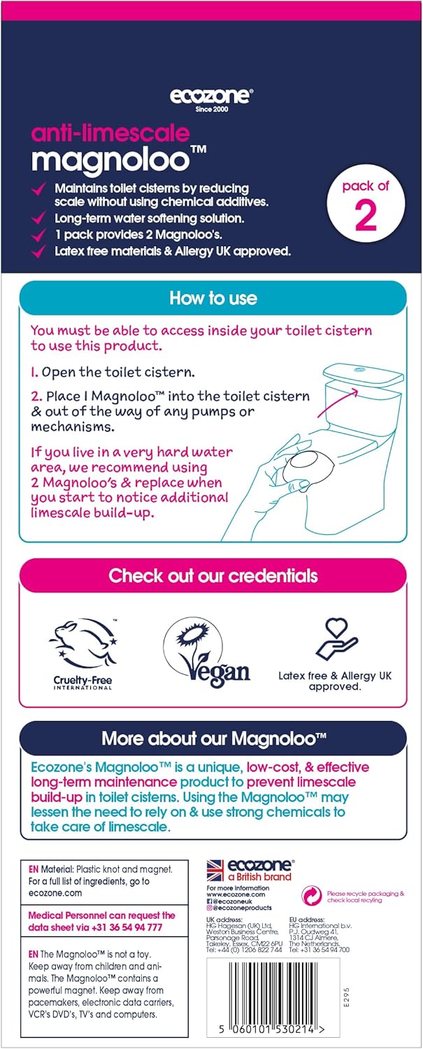About this item Maintains & prevents limescale build-up Discrete in cistern application Long term, water softening solution Non-toxic & bleach-free 2 Pack for use in 2 toilets Suitable for all cisterns that are accessible Cruelty-free, Vegan, Allergy UK & PETA endorsed › See more product details,Maintains & prevents limescale build-up,Discrete in cistern application,Long term, water softening solution,Non-toxic & bleach-free,2 Pack for use in 2 toilets,Suitable for all cisterns that are accessible,Cruelty-free, Vegan, Allergy UK & PETA endorsed