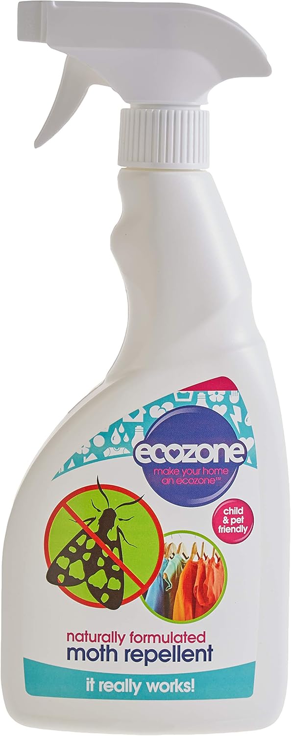 About this item EcoZone Moth Repellent: Contains a naturally formulated complex blend of essential oils that work to create a barrier, to stop moths settling on soft furnishings, upholstery and fabric in your home Pet and child friendly: This natural moth spray treatment works to gently repel moths, rather than kill or harm them. One application can provide up to two months’ protection, with no harsh chemicals Cruelty free, gentle vegan-friendly formula: Approved by PETA and not tested on animals. Contains no animal products. Approved by Allergy UK to be allergy friendly and safe for sensitive skin The power of plants: The pure, natural ingredients include cedar oil – a beautiful smell to humans but hated by moths! Contains only plant-based ingredients, safe to use around all fabrics or textiles A smart green clean with EcoZone: Created by families for families. Environmentally friendly cleaning products that work, inspired by plant-based, natural ingredients with no nasty hidden chemicals › See more product details,EcoZone Moth Repellent: Contains a naturally formulated complex blend of essential oils that work to create a barrier, to stop moths settling on soft furnishings, upholstery and fabric in your home,Pet and child friendly: This natural moth spray treatment works to gently repel moths, rather than kill or harm them. One application can provide up to two months’ protection, with no harsh chemicals,Cruelty free, gentle vegan-friendly formula: Approved by PETA and not tested on animals. Contains no animal products. Approved by Allergy UK to be allergy friendly and safe for sensitive skin,The power of plants: The pure, natural ingredients include cedar oil – a beautiful smell to humans but hated by moths! Contains only plant-based ingredients, safe to use around all fabrics or textiles,A smart green clean with EcoZone: Created by families for families. Environmentally friendly cleaning products that work, inspired by plant-based, natural ingredients with no nasty hidden chemicals