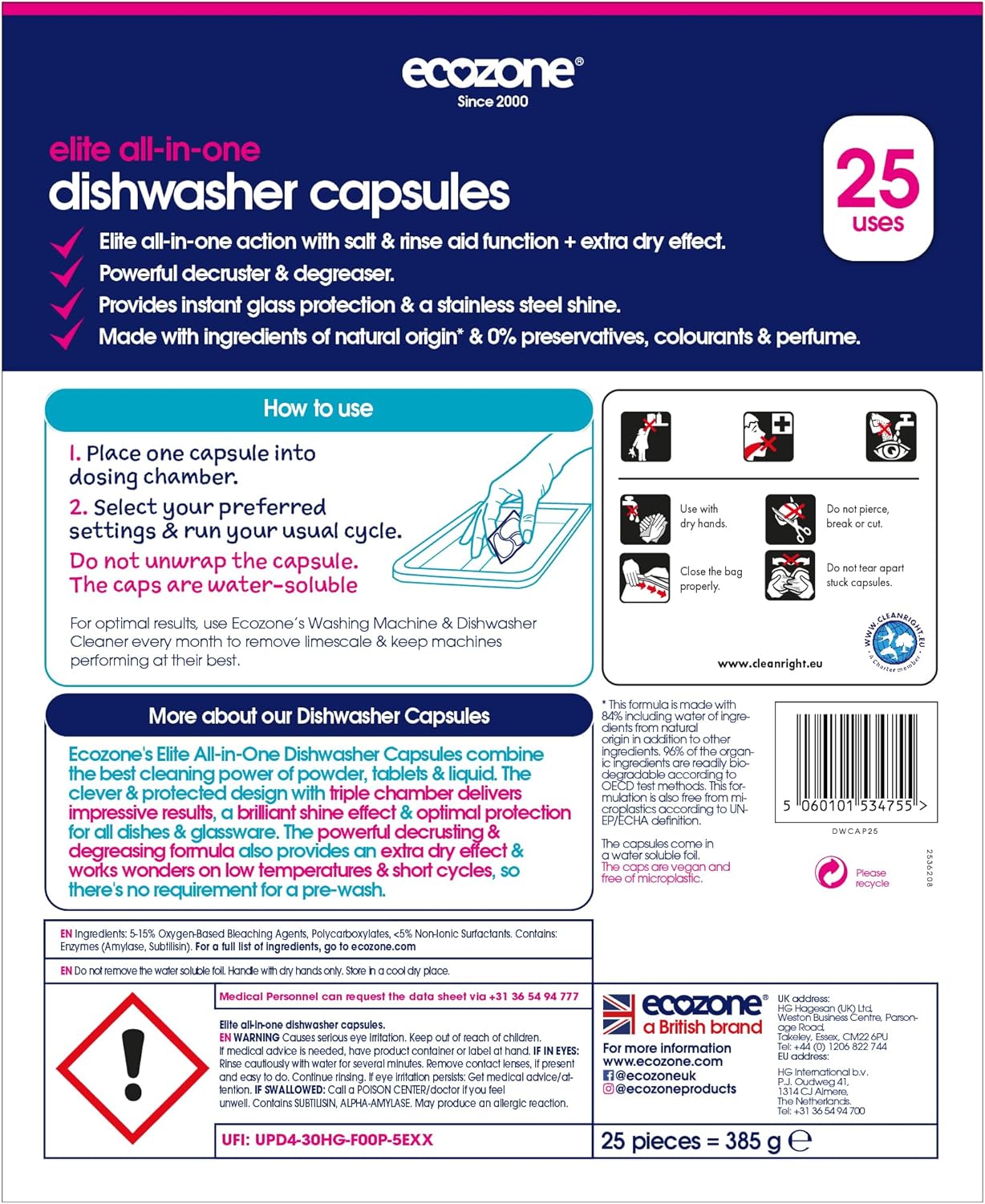 About this item Ecozone Optimum 25 dishwasher capsules: These ultra 3-in-1 dishwasher capsules offer a superior cleaning action that leaves dishes, cups, cutlery and glasses shiny, streak-free and sparkling All-in-one supreme clean: Cuts through the toughest grease and grime, with a built-in decruster and degreaser action. Works wonders on short cycles and even at low temperatures Eco dishwasher capsules: Formulated using predominantly natural ingredients, the non toxic dishwasher capsules provide instant glass protection and a stainless steel shine Cruelty free, gentle and vegan friendly: Approved by PETA and not tested on animals. Contains no animal products. Aquatic life safe and septic tank safe. Free from perfume and colour A smart green clean with Ecozone: Created by families for families. Environmentally conscious cleaning products that work, inspired by plant-based, natural ingredients with no hidden chemicals › See more product details,Ecozone Optimum 25 dishwasher capsules: These ultra 3-in-1 dishwasher capsules offer a superior cleaning action that leaves dishes, cups, cutlery and glasses shiny, streak-free and sparkling,All-in-one supreme clean: Cuts through the toughest grease and grime, with a built-in decruster and degreaser action. Works wonders on short cycles and even at low temperatures,Eco dishwasher capsules: Formulated using predominantly natural ingredients, the non toxic dishwasher capsules provide instant glass protection and a stainless steel shine,Cruelty free, gentle and vegan friendly: Approved by PETA and not tested on animals. Contains no animal products. Aquatic life safe and septic tank safe. Free from perfume and colour,A smart green clean with Ecozone: Created by families for families. Environmentally conscious cleaning products that work, inspired by plant-based, natural ingredients with no hidden chemicals