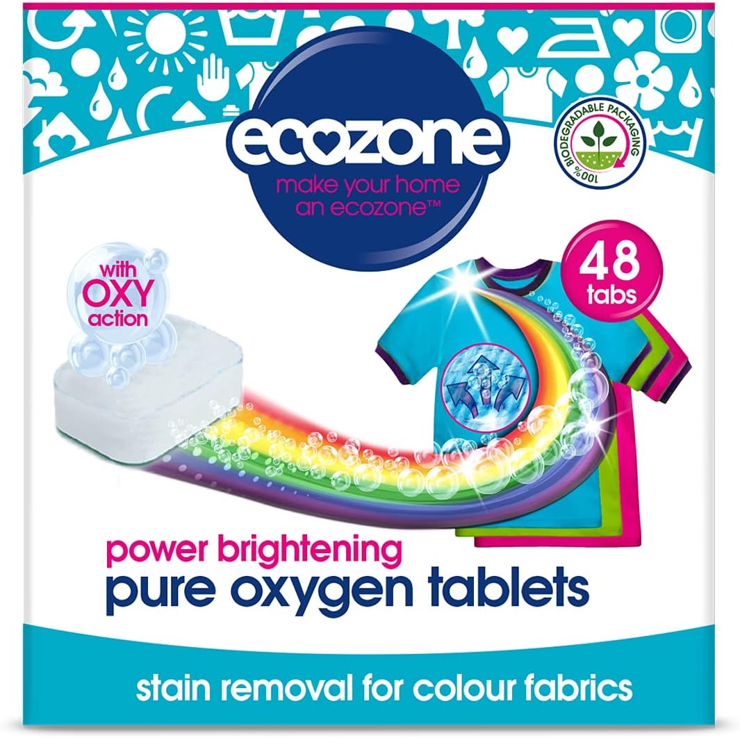 Product Description Ecozone’s Pure Oxygen Laundry Brightening Tablets are designed to bring your colours back to life by removing stains and grime enhancing the original colour of the fabric. Easy to use, simply add one tablet to every wash with your usual detergent option and fabric conditioner. The brightening tablets are free from toxic chemicals, harnessing just the power of oxygen to lift dirt from your fabrics. Ingredients Sodium Carbonate Peroxide, Sodium Bicarbonate, Citric Acid, Sodium Sulfate, Sodium Chloride, Sodium Carbonate, Tetraacetyl Ethylene Diamine (TAED), MICROCRYSTALLINE CELLULOSE, Polyethilenglicol, bentonite, C11 alcohol condensed with alkylene oxides, HYDROGENATED STARCH HYDROLYSATE, Sodium Silicate, Subtilisin, talc, Alfa – Amylase, parfume, Magnesium stearate,Powerful stain removal for coloured fabrics,Free from chloride bleach & optical brighteners,Revives colours by using an oxy action formula,Item package weight: 1.03 kilograms