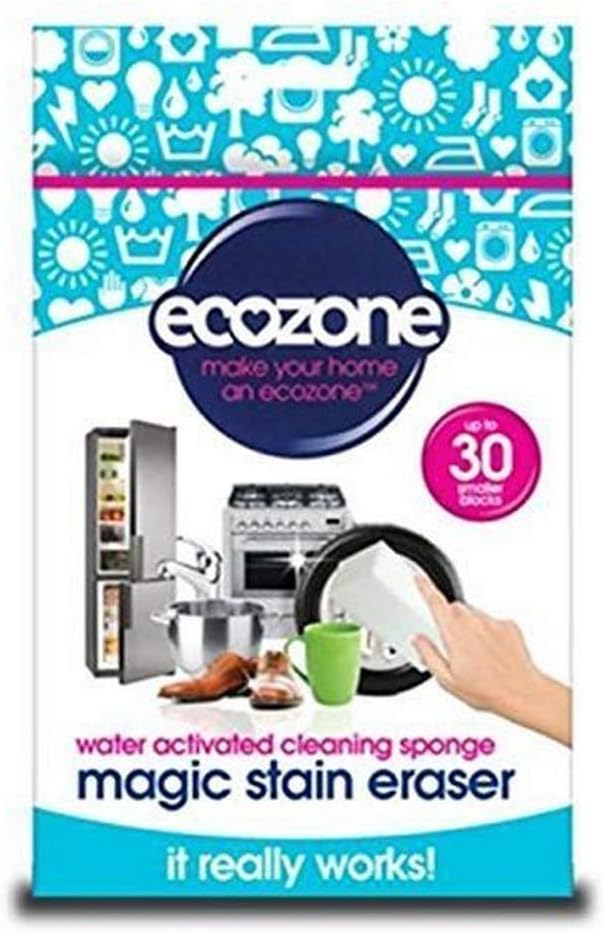 Product Description Do away with expensive cleaning chemicals and let the might of the Stain Eraser do the work for you! Just dampen with water and the non-abrasive sponge block becomes a strong eraser that shifts stubborn stains and marks clean away. The fine micro-texture of the sponge can cut through almost anything and makes light work of tough and awkward stains. Handy for all sorts of jobs about the house, the Stain Eraser will save you money compared to buying expensive cleaning products, and make cleaning a doddle. Youāll wonder how you lived without it. Ecozone Stain Eraser comes in one extra large block. Each block can be cut to size to fit any of those hard-to-reach places. Easy. Stain Eraserās easy to use. Hereās how: 1. Take the Stain Eraser sponge from the pack and cut off a small block 2. Lightly moisten the small block 3. Scrub lightly over stains and watch them fade away. Box Contains 1 x Ecozone Magical Stain Eraser Single (Pack of 2),High density eraser removes stubborn stains with ease,Cleans with just water, great for tackling awkward crannies,Effective at shifting scuff marks, lime scale, and crayon marks on walls,Sponges can be cut to any size and shape