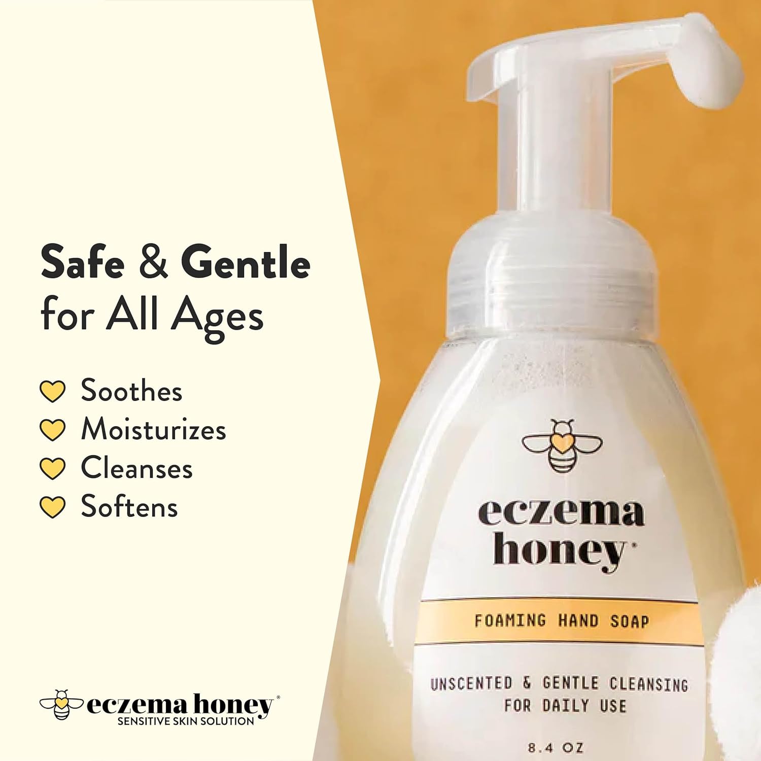 About this item Leaves Hands Clean & Nutures Skin - Great for working hands, Eczema Honey's Gentle Foaming Hand Soap nourishes and cleanses with coconut oil, palm oil, hemp oil, and olive oil Helps Hydrate Hands - This moisturizing hand soap, formulated with organic honey, keeps your hands soft during eczema flare-ups or cold weather Natural Ingredients to Help Irritation - Our lightweight non toxic hand soap soothes dry and cracked skin caused by eczema or other conditions with colloidal oatmeal No Harmful Chemicals & Fragrance-Free - Made with no parabens, sulfates, phthalates, or scents, our Leaping Bunny Certified bathroom soap is cruelty-free Sensitive Enough for Daily Use - Featured on MindBodyGreen, Eczema Honey Gentle Foaming Hand Soap is a mild, skin-friendly, unscented soap that can be used daily to cleanse hands See more product details,Leaves Hands Clean & Nutures Skin - Great for working hands, Eczema Honey's Gentle Foaming Hand Soap nourishes and cleanses with coconut oil, palm oil, hemp oil, and olive oil,Helps Hydrate Hands - This moisturizing hand soap, formulated with organic honey, keeps your hands soft during eczema flare-ups or cold weather,Natural Ingredients to Help Irritation - Our lightweight non toxic hand soap soothes dry and cracked skin caused by eczema or other conditions with colloidal oatmeal,No Harmful Chemicals & Fragrance-Free - Made with no parabens, sulfates, phthalates, or scents, our Leaping Bunny Certified bathroom soap is cruelty-free,Sensitive Enough for Daily Use - Featured on MindBodyGreen, Eczema Honey Gentle Foaming Hand Soap is a mild, skin-friendly, unscented soap that can be used daily to cleanse hands