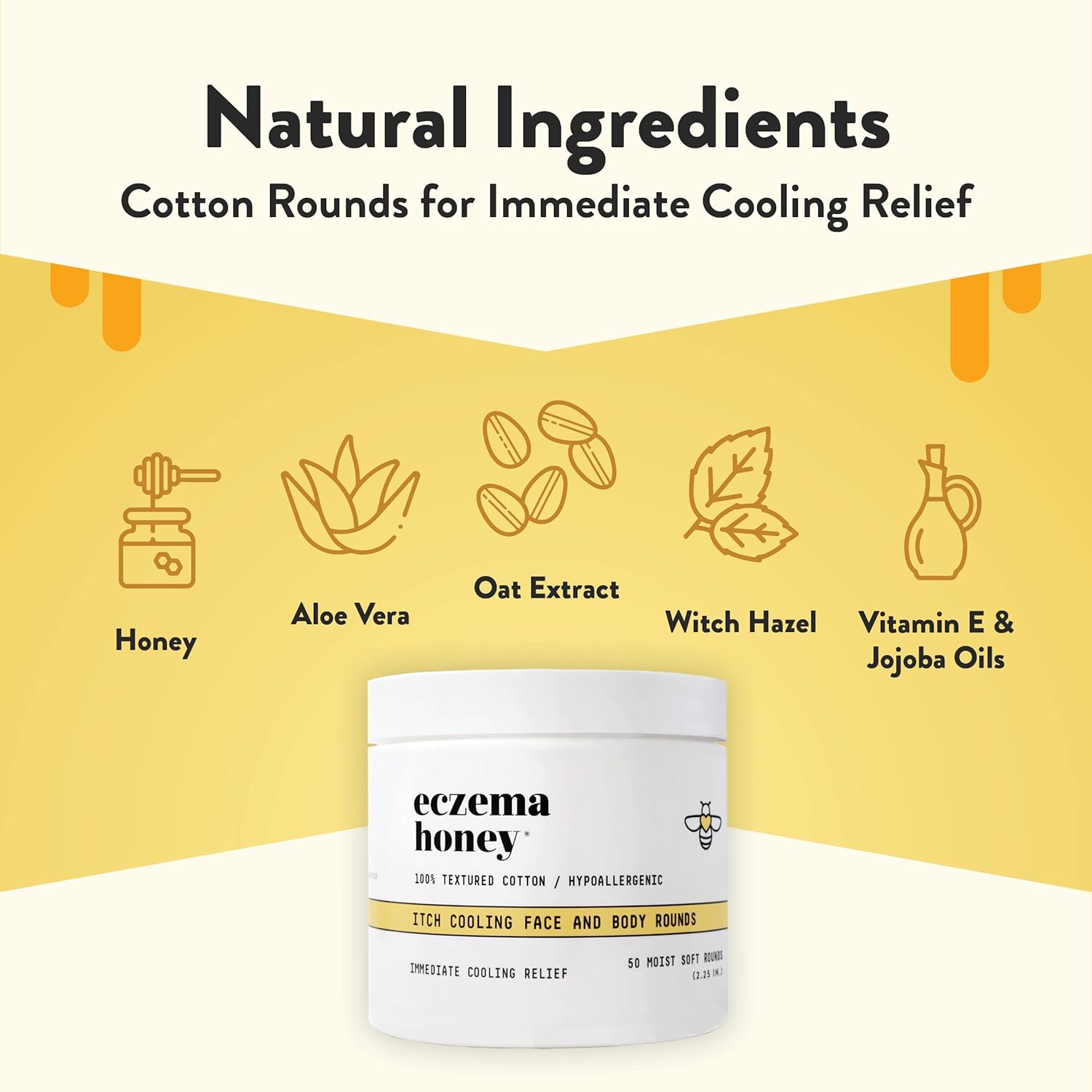 About this item Relieve Eczema & Irritation - Immediately soothing your skin, feel cool and all-day comfort using Eczema Honey Itch Cooling Face & Body Rounds Moisturizer for Dry Skin - Keeps your hand, arms, or legs smooth during flare-ups with Eczema Honey Itch Cooling Face & Body Rounds containing witch hazel, aloe vera juice, and honey Helps Eczema & Irritation Symptoms - Providing a thin protective barrier, feel relief and all-day comfort anywhere on your body when using Eczema Honey Oatmeal Body Lotion Moisturizer for Dry Skin - Keeps your hands, arms, or legs smooth during flare-ups with Eczema Honey Oatmeal Body Lotion containing hydrating cocoa butter, shea butter, aloe vera, and organic honey No Harmful Chemicals & Cruelty-Free - Made with no parabens, sulfates, phthalates, or fragrances, this Leaping Bunny Certified eczema products naturally cools your skin See more product details,Relieve Eczema & Irritation - Immediately soothing your skin, feel cool and all-day comfort using Eczema Honey Itch Cooling Face & Body Rounds,Moisturizer for Dry Skin - Keeps your hand, arms, or legs smooth during flare-ups with Eczema Honey Itch Cooling Face & Body Rounds containing witch hazel, aloe vera juice, and honey,Helps Eczema & Irritation Symptoms - Providing a thin protective barrier, feel relief and all-day comfort anywhere on your body when using Eczema Honey Oatmeal Body Lotion,Moisturizer for Dry Skin - Keeps your hands, arms, or legs smooth during flare-ups with Eczema Honey Oatmeal Body Lotion containing hydrating cocoa butter, shea butter, aloe vera, and organic honey,No Harmful Chemicals & Cruelty-Free - Made with no parabens, sulfates, phthalates, or fragrances, this Leaping Bunny Certified eczema products naturally cools your skin