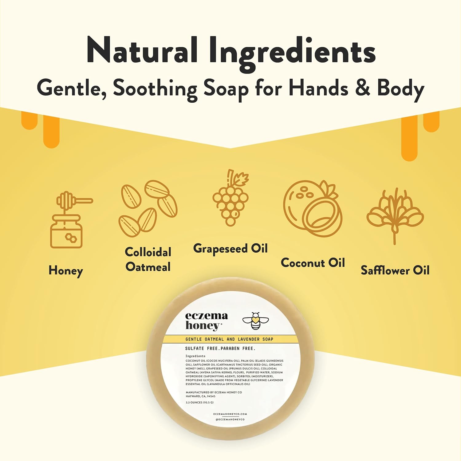 About this item Relieve Eczema & Irritation - Formulated to help keep you clear from dry patches, our Eczema Honey Oatmeal and Lavender Soap comforts fast with honey and grapeseed oil Daily Bodywash Hydrates - Feeling smooth and refreshed after, Eczema Honey Oatmeal and Lavender Soap gently removes dirt from eczema-prone skin without harsh exfoliating Helps Eczema & Itch Symptoms - Providing a thin protective barrier, feel relief and all-day comfort anywhere on your body when using Eczema Honey Oatmeal Body Lotion Moisturizer for Dry Skin - Keeps your hands, arms, or legs smooth during flare-ups with Eczema Honey Oatmeal Body Lotion containing hydrating cocoa butter, shea butter, aloe vera, and organic honey No Harmful Chemicals & Cruelty-Free - Made with no parabens, sulfates, phthalates, or fragrances, this Leaping Bunny Certified eczema products naturally cools your skin See more product details,Relieve Eczema & Irritation - Formulated to help keep you clear from dry patches, our Eczema Honey Oatmeal and Lavender Soap comforts fast with honey and grapeseed oil,Daily Bodywash Hydrates - Feeling smooth and refreshed after, Eczema Honey Oatmeal and Lavender Soap gently removes dirt from eczema-prone skin without harsh exfoliating,Helps Eczema & Itch Symptoms - Providing a thin protective barrier, feel relief and all-day comfort anywhere on your body when using Eczema Honey Oatmeal Body Lotion,Moisturizer for Dry Skin - Keeps your hands, arms, or legs smooth during flare-ups with Eczema Honey Oatmeal Body Lotion containing hydrating cocoa butter, shea butter, aloe vera, and organic honey,No Harmful Chemicals & Cruelty-Free - Made with no parabens, sulfates, phthalates, or fragrances, this Leaping Bunny Certified eczema products naturally cools your skin