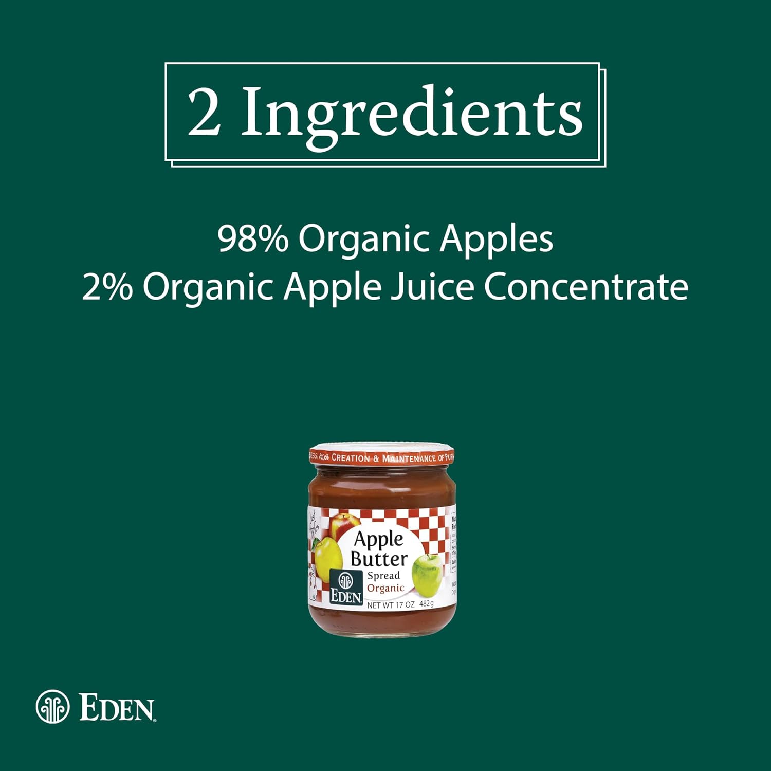 About this item A blend of family orchard Great Lakes' organic Apple varieties, over four pounds to a jar. Hand sorted, washed, peeled, cored, chopped, and slowly kettle simmered with a bit of organic apple juice concentrate to 30 Brix. A tangy sweet spread that makes healthy eating an easy pleasure with its versatility. No refined sugar or anything else ever added. The apples in Eden Apple Butter are organically grown on family owned orchards on the shores of the Great Lakes, one of the best tree fruit growing locations in the world due to the seasonal lake effect. After years of organic management, the healthy trees and soil in these beautiful orchards produce the most delicious apples we have ever tasted. A carefully selected blend of apples are hand sorted, washed, peeled, cored and chopped. A small amount of our organic apple juice concentrate is added to the apples that are patiently steam jacketed kettle simmered until perfect. When finished the apple butter is packed in glass jars. Eden Organic Apple Butter is a tangy, sweet spread. A jar in your refrigerator makes it easy and fun to eat healthy food. Dollop it on oatmeal and cereal; spread it on toast, pancakes and waffles; use in batter for moist, flavorful baked goods. Use it instead of butter, jam, jelly or frosting. It is fat free and sodium free with no refined sugars. See more product details,A blend of family orchard Great Lakes' organic Apple varieties, over four pounds to a jar. Hand sorted, washed, peeled, cored, chopped, and slowly kettle simmered with a bit of organic apple juice concentrate to 30 Brix,A tangy sweet spread that makes healthy eating an easy pleasure with its versatility. No refined sugar or anything else ever added,The apples in Eden Apple Butter are organically grown on family owned orchards on the shores of the Great Lakes, one of the best tree fruit growing locations in the world due to the seasonal lake effect. After years of organic management, the healthy trees and soil in these beautiful orchards produce the most delicious apples we have ever tasted,A carefully selected blend of apples are hand sorted, washed, peeled, cored and chopped. A small amount of our organic apple juice concentrate is added to the apples that are patiently steam jacketed kettle simmered until perfect. When finished the apple butter is packed in glass jars,Eden Organic Apple Butter is a tangy, sweet spread. A jar in your refrigerator makes it easy and fun to eat healthy food. Dollop it on oatmeal and cereal; spread it on toast, pancakes and waffles; use in batter for moist, flavorful baked goods. Use it instead of butter, jam, jelly or frosting. It is fat free and sodium free with no refined sugars