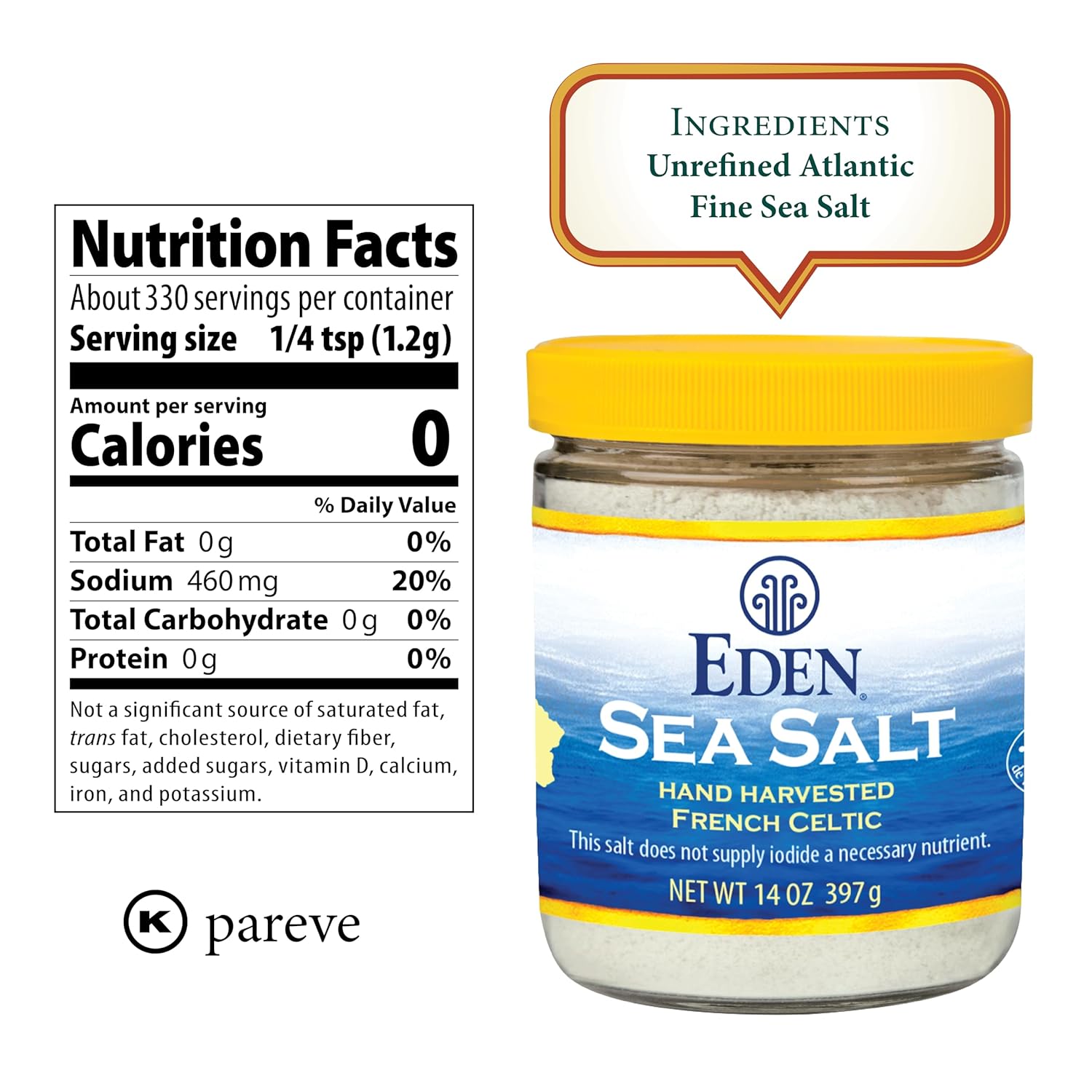 Eden Sea Salt, Hand Harvested French Celtic, Stone Ground (Fine), 82 Trace Minerals, Unrefined, Glass Jar, 14 Oz