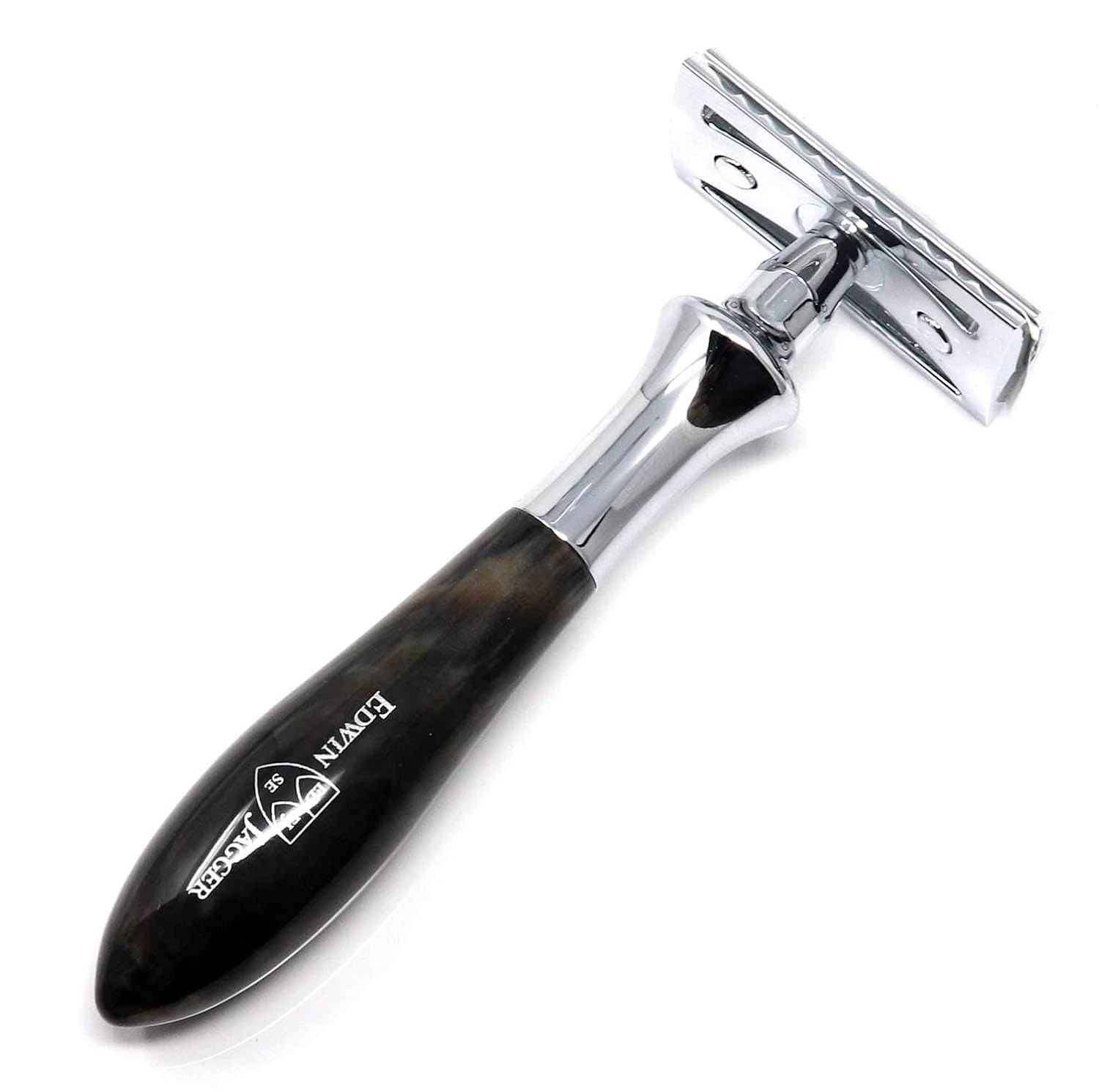 About this item Edwin Jagger Plaza Imitation Ebony DE Razor Beautifully balanced for smooth, close shave - Perfect for new & experienced DE shavers Handle 100mm (3.94") | Razor weight - 74g Closed comb DE head Edwin Jagger branded box  See more product details,Edwin Jagger Plaza Imitation Ebony DE Razor,Beautifully balanced for smooth, close shave - Perfect for new & experienced DE shavers,Handle 100mm (3.94") | Razor weight - 74g,Closed comb DE head,Edwin Jagger branded box