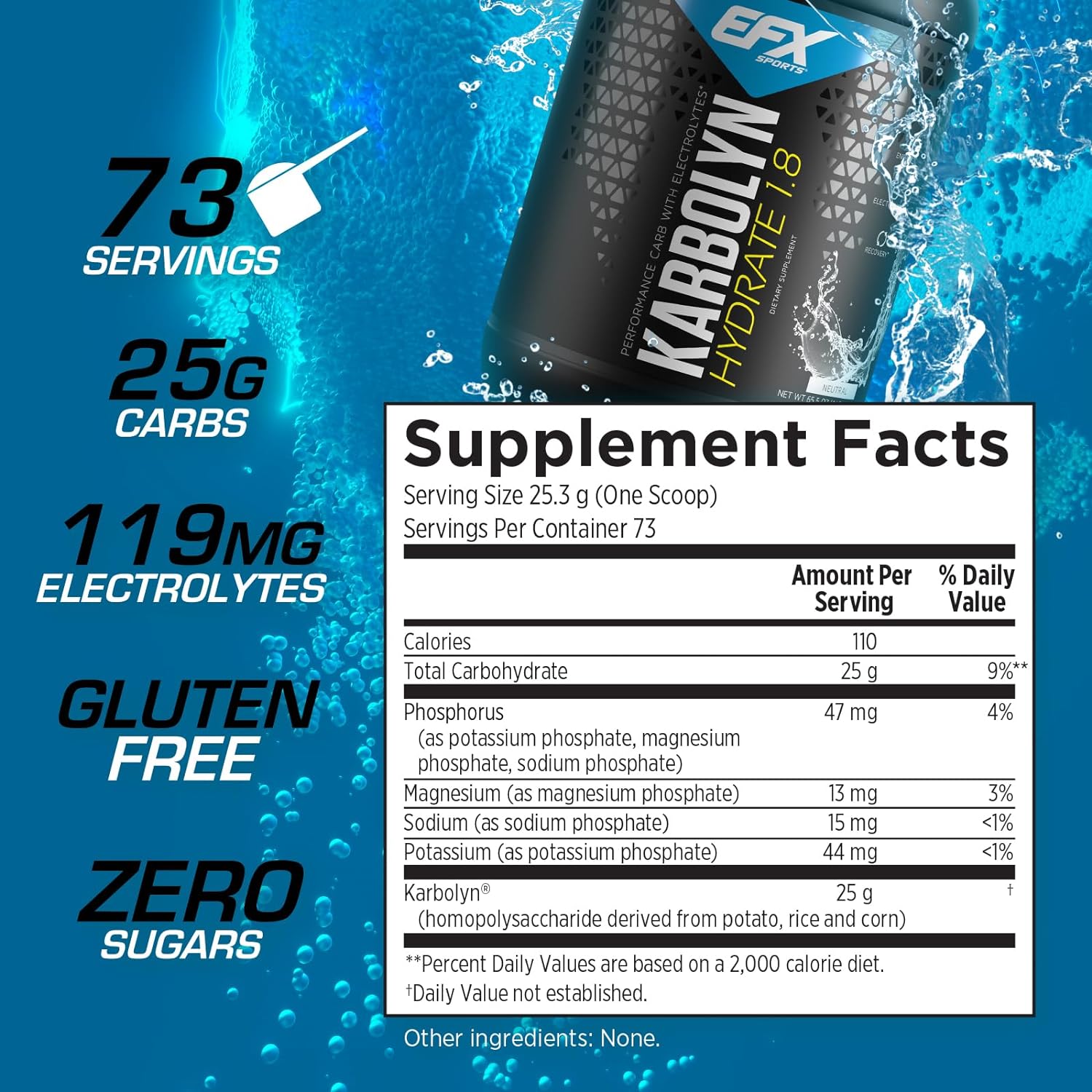 DESCRIPTION : EFX Sports Karbolyn Hydrate | Carbohydrate Powder + Electrolytes | Sugar Free Sports Drink Mix | Fuel & Hydration | Stimulant Free | 66 Servings (Neutral)