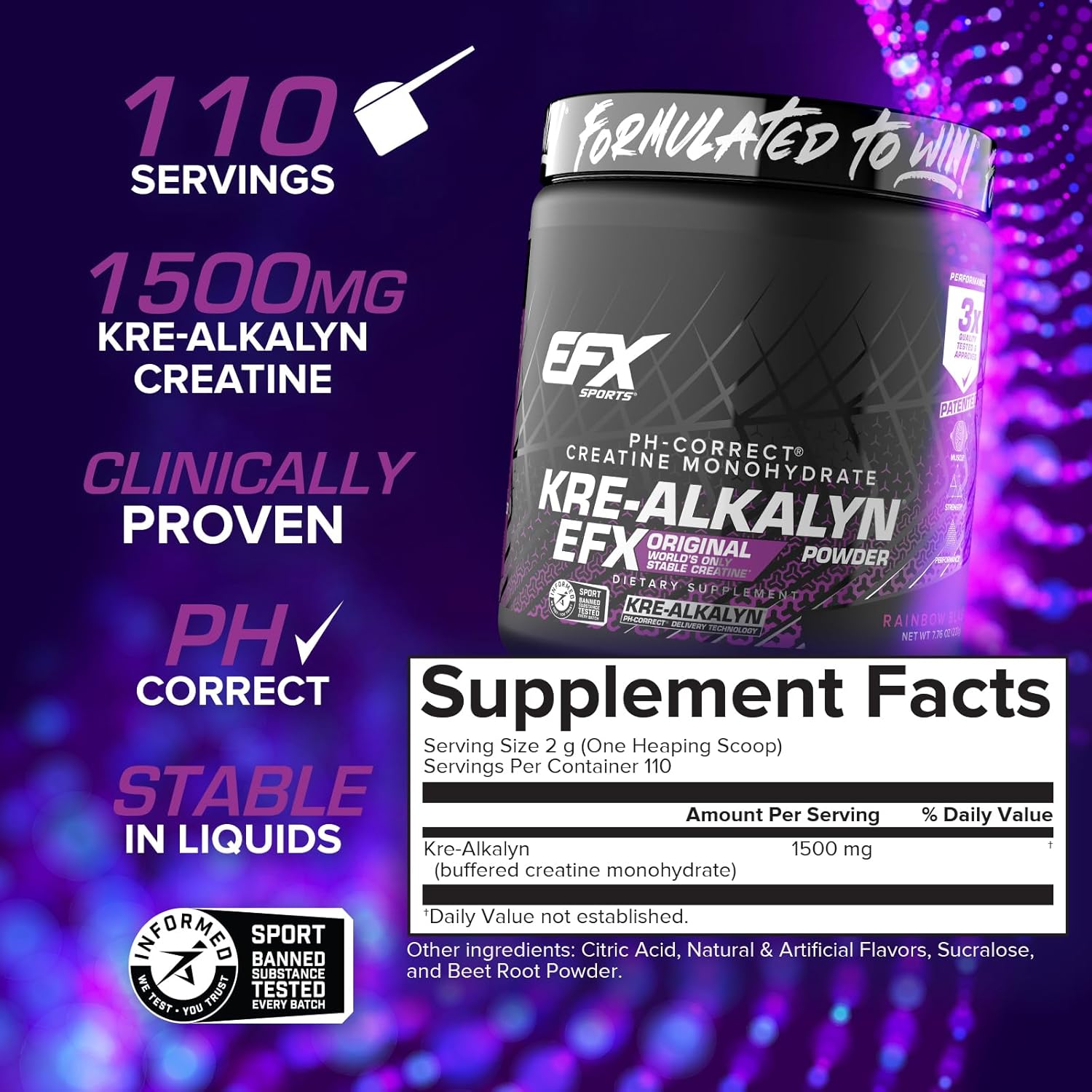 About this item MULTI-PATENTED PH-CORRECT CREATINE by Dr. Jeff Golini: Kre Alkalyn EFX offers a superior alternative to other creatine products. Traditional creatine supplements have pH levels below 7, which immediately begin converting to creatinine â a useless waste product â when mixed with a solution. Kre Alkalyn EFX, however, has a multi-patented pH range of 12-14, resulting in a buffered, stable creatine monohydrate. This means you only need 1.5-3 grams with no loading, no bloating, and no side effects! CRUSH YOUR STRENGTH GAINS: Creatine monohydrate is the single most studied sports supplement ever. Itâs the top pre- and post- workout compound for athletes and bodybuilders who want to gain muscle mass, increase power, enhance performance, and accelerate muscle recovery. Kre Alkalyn EFX is 99.9% pure creatine monohydrateâscience-backed, clinically tested, and safe. MIX & ENJOY: Our Kre Alkalyn EFX creatine powder easily mixes in water or your favorite drink for maximum strength and performance, no matter your fitness goals. Try one of our delicious fruity flavors or enjoy the classic unflavored powder before or after any intense training session. Just scoop, mix, and get to work! MANUFACTURED IN-HOUSE: EFX Sports is part of a very small, elite group of brands who actually make their own products. Thatâs why we guarantee Kre Alkalyn EFX always meets label claims and is 100% banned-substance free (certified by Informed Sport). With any EFX Sports product, you'll know that you're getting a pure, potent, and safe product. 3X QUALITY TESTING: At EFX Sports, we proudly own every phase of the manufacturing process to ensure what's on the label is what's in the bottle...without question. In fact, every EFX Sports product must pass 3 critical quality checkpointsâbefore, during and after production. See more product details,MULTI-PATENTED PH-CORRECT CREATINE by Dr. Jeff Golini: Kre Alkalyn EFX offers a superior alternative to other creatine products. Traditional creatine supplements have pH levels below 7, which immediately begin converting to creatinine â a useless waste product â when mixed with a solution. Kre Alkalyn EFX, however, has a multi-patented pH range of 12-14, resulting in a buffered, stable creatine monohydrate. This means you only need 1.5-3 grams with no loading, no bloating, and no side effects!,CRUSH YOUR STRENGTH GAINS: Creatine monohydrate is the single most studied sports supplement ever. Itâs the top pre- and post- workout compound for athletes and bodybuilders who want to gain muscle mass, increase power, enhance performance, and accelerate muscle recovery. Kre Alkalyn EFX is 99.9% pure creatine monohydrateâscience-backed, clinically tested, and safe,MIX & ENJOY: Our Kre Alkalyn EFX creatine powder easily mixes in water or your favorite drink for maximum strength and performance, no matter your fitness goals. Try one of our delicious fruity flavors or enjoy the classic unflavored powder before or after any intense training session. Just scoop, mix, and get to work!,MANUFACTURED IN-HOUSE: EFX Sports is part of a very small, elite group of brands who actually make their own products. Thatâs why we guarantee Kre Alkalyn EFX always meets label claims and is 100% banned-substance free (certified by Informed Sport). With any EFX Sports product, you'll know that you're getting a pure, potent, and safe product,3X QUALITY TESTING: At EFX Sports, we proudly own every phase of the manufacturing process to ensure what's on the label is what's in the bottle...without question. In fact, every EFX Sports product must pass 3 critical quality checkpointsâbefore, during and after production