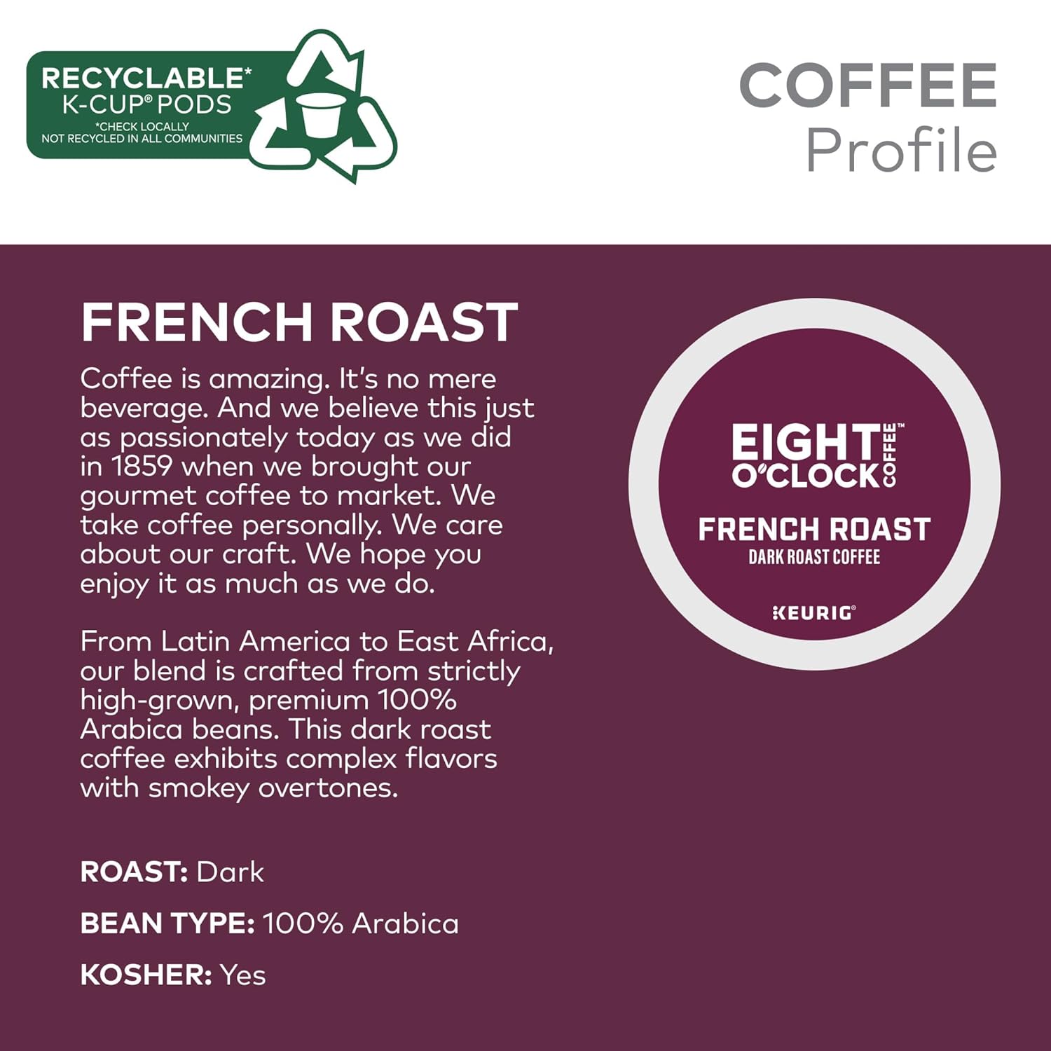 Make Your Morning Routine A Little Easier With The French Roast Coffee K-Cup Pods From Eight O'Clock Coffee. A Delicious Blend Of Premium 100 Percent Arabica Coffee At A Medium Roast. Outstandingly Smooth, Yet Full-Bodied With A Complex Finish, This Coffee May Be âOriginalâ But ItâS Certainly Not Boring. This Coffee Features A Classic Medium Roast With A Bold Flavor For A Smooth And Refreshing Coffee Beverage That Will Prepare You For Your Day. Introducing Recyclable K-Cup Pods: Simple. Delicious. And Now Recyclable. Enjoy The Same Great-Tasting Coffee You Know And Love, And When YouâRe Done Just Peel, Empty And Recycle. Check Locally, Not Recycled In All Communities. Packaging May Vary