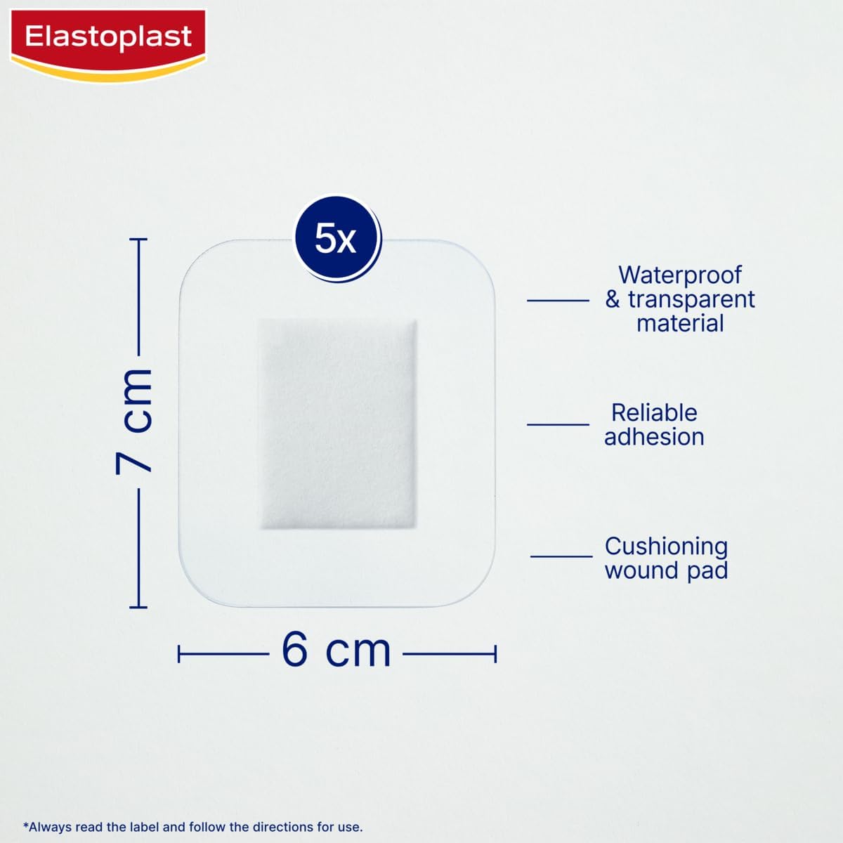 Elastoplast Waterproof Xl Med+ Dressings (5 Pieces), Pack Of First Aid Plasters, Large Plasters For Post-Operative Wounds, Waterproof Sterile Dressing For Wounds, 0% Latex, Flexible Material, Clear