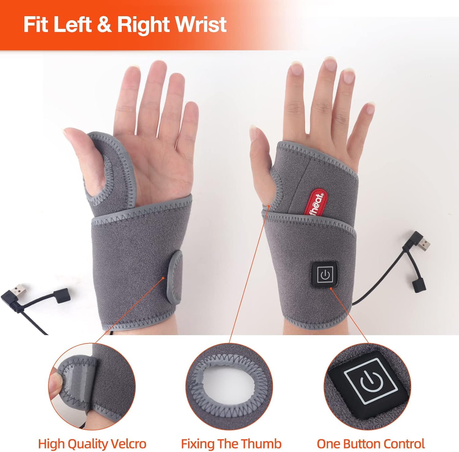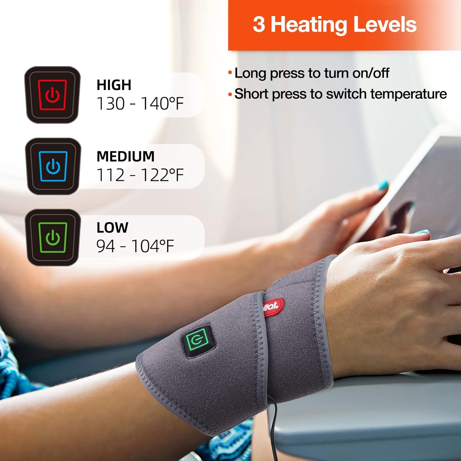 USB Powered for Portability - The heated wrist wrap comes with a 59-inch USB cable that will work by simply plugging it into any USB power source with a 2-amp output. For example, a wall adapter, power bank, or car USB port. So you can use it while traveling, at the office, driving or at home