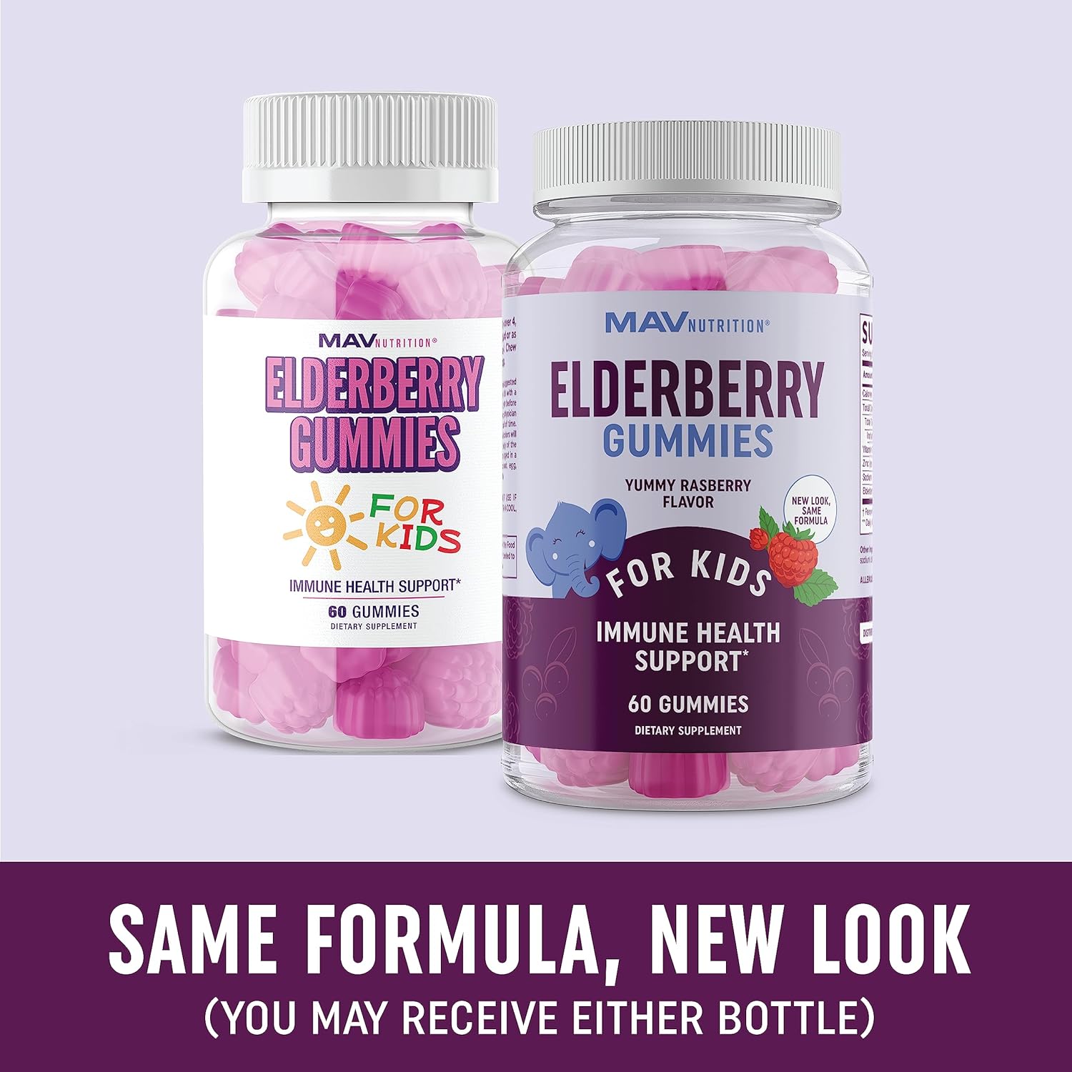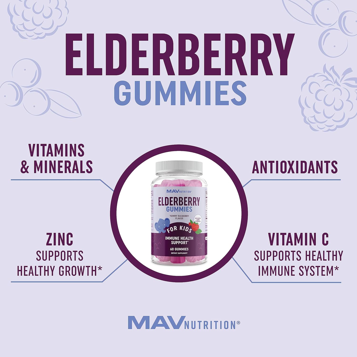 FOR AGES 4+: These tasty Elderberry Gummies are carefully created for children 4 years and older for year-round immune support103-IN-1 SUPPORT: Our yummy raspberry flavored gummies include 50mg of Elderberry Fruit plus Vitamin C and Zinc in a pectin-based gummy for a healthy dose each day, giving your child additional immune support10FUN IMMUNE SUPPORT ROUTINE: This formula can help support your childās immune system with a supplement they crave every day. Theyāll look forward to their daily gummy and love the Raspberry Flavor10HIGH IN ANTIOXIDANTS: Elderberries have naturally occurring anthocyanins that provide good antioxidant support.* Antioxidants can help neutralize free radicals, promoting good overall health10COMMITTED TO QUALITY: MAV Nutritionās commitment to quality ensures that you and your family get only the best. Our Kidsā Elderberry Gummies are Gluten-Free, Non-GMO, and formulated in the USA. They contain NO high-fructose corn syrup or artificial flavors or colors1010