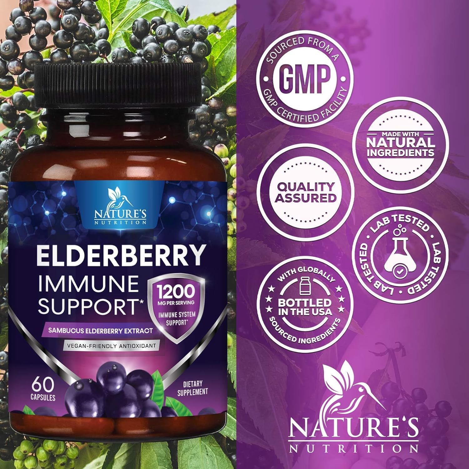 Elderberry Immune Support: Nature's Nutrition Elderberry Extract Capsules feature a potent 10:1 Sambucus Black Elderberry concentration for daily adult immune support, superior to elderberry supplements