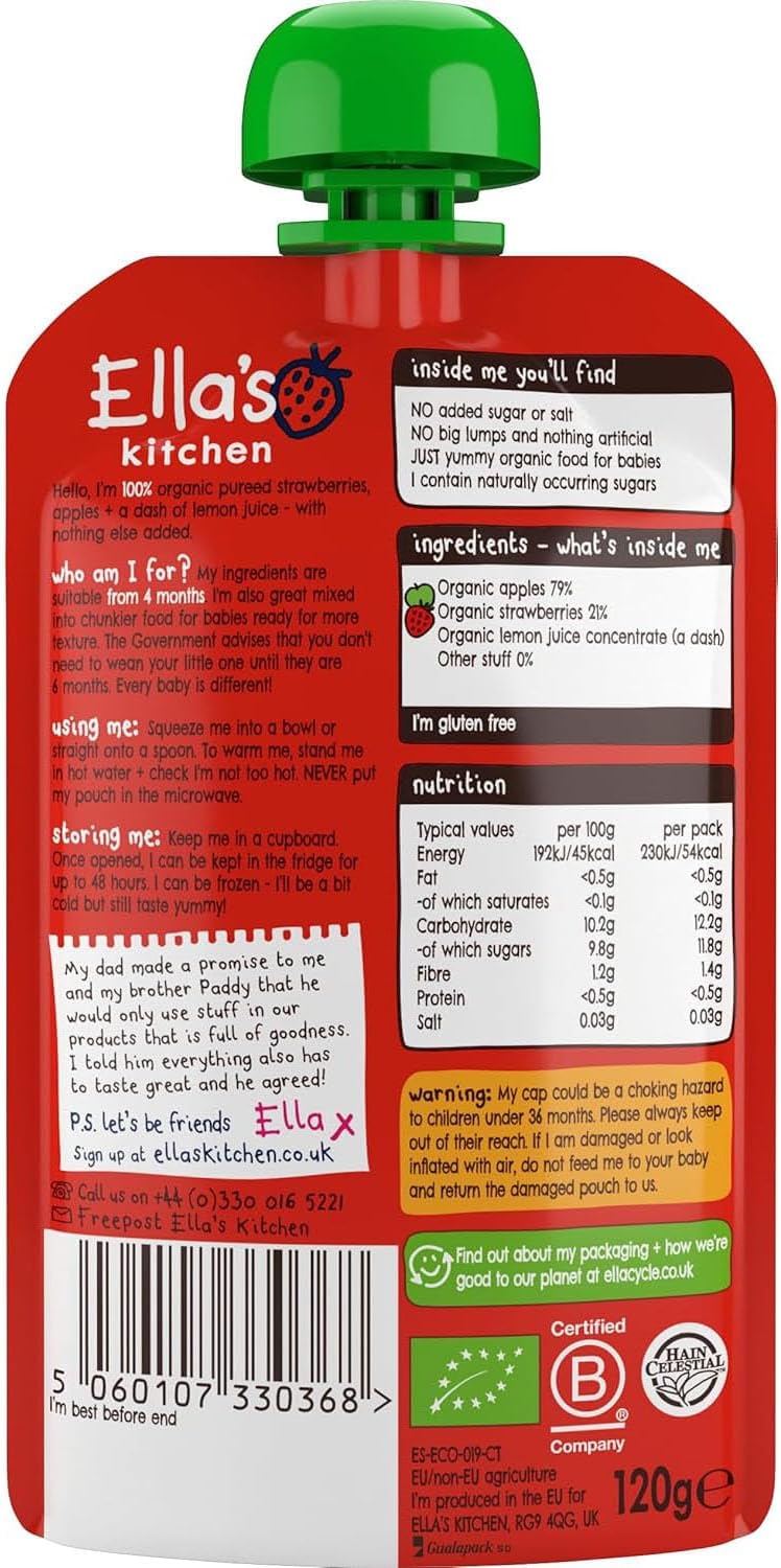 Product Description We think it's important to always approach things from a child's point of view. So, we've taken simple, natural ingredients that ooze goodness and created foods, and packaging, that should really connect with kids - with flavours, colours, textures and even names that will appeal to all of their senses. Ingredients Pureed Organic Apples (52%), Pureed Organic Sweet Potatoes (23%), Pureed Organic Pumpkin (20%), Pureed Organic Blueberries (5%), Organic Lemon Juice Concentrate (a dash), Other Stuff (0%) Allergy Information: Free From Gluten, Free From Wheat, Free From Eggs, Free From Lactose, Free From Dairy P.when('A').execute(function(A) { A.on('a:expander:toggle_description:toggle:collapse', function(data) { window.scroll(0, data.expander.$expander[0].offsetTop-100); }); }); Directions Babies love me warm or cold. Cooking Me: Shake me, squeeze me and stir me into a clean bowl. If you want me warm, stand me in hot water first, then stir me and always test my temperature before serving. My pouch should never be put in a microwave. Who Am I For The Government advises that you don't need to wean your baby until 6 months. If you choose to wean earlier, my ingredients are suitable from 4 months. I'm also great for babies + toddlers who already eat chunkier foods, try mixing me with chopped protein, fruit or veg for a nutritious meal or offer me all alone as a healthy snack. Safety Warning Warning: I have a small cap which could be a potential choking hazard to children under 36 months and so should be kept out of their reach at all times. If my pouch is damaged or it looks unusually inflated with air, do not feed me to your baby. Box Contains Each order comes with 7 x 120g Ella's Kitchen Stage 1 Organic Sweet Potato, Pumpkin, Apple and Blueberries See more,Just yummy organic food for babies - perfect for stage 1 weaning and beyond,No added sugar, salt or water - contains naturally occurring sugars,No additives or thickeners, E numbers or GM ingredients,No dairy, egg, wheat, lactose or gluten,No lumps or bits and nothing artificial