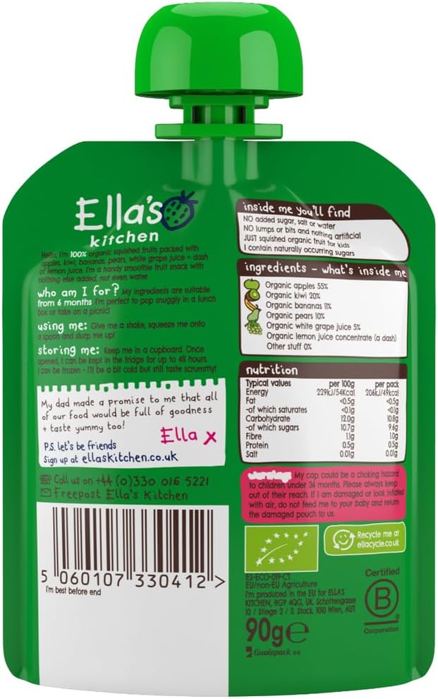 About this item 100% apples, pears, bananas and kiwi fruit with a dash of lemon juice An organic Smoothie Fruit snack, with nothing else added, not even water No added sugar or salt and contain naturally occurring sugars No lumps or bits and nothing artificial Suitable for babies from 6 months › See more product details,100% apples, pears, bananas and kiwi fruit with a dash of lemon juice,An organic Smoothie Fruit snack, with nothing else added, not even water,No added sugar or salt and contain naturally occurring sugars,No lumps or bits and nothing artificial,Suitable for babies from 6 months