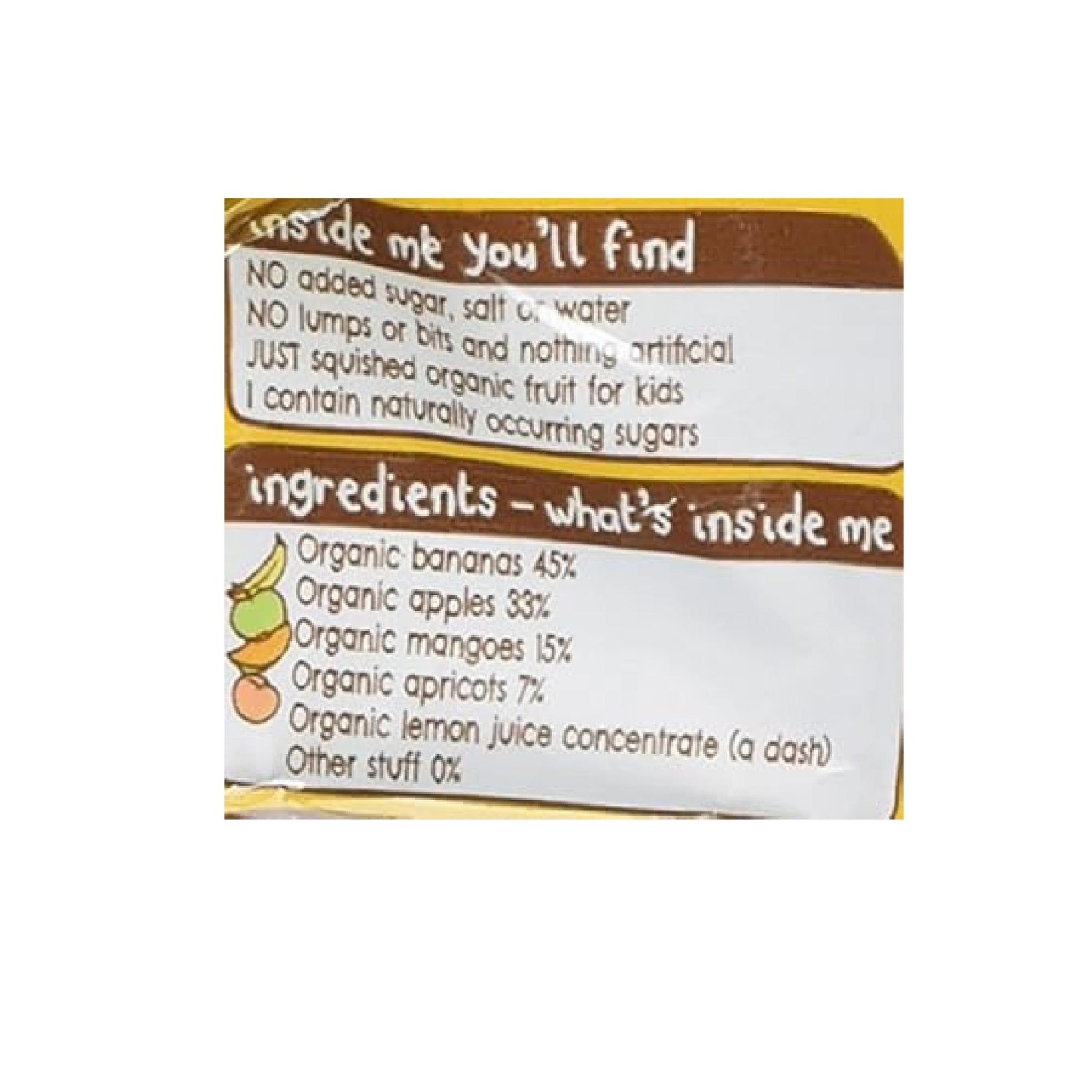 Product Description We think it's important to always approach things from a child's point of view. So, we've taken simple, natural ingredients that ooze goodness and created foods, and packaging, that should really connect with kids - with flavours, colours, textures and even names that will appeal to all of their senses. Ingredients Organic Bananas 40%, Organic Apples 37%, Organic Pineapples 5%, Organic Apricots 18%, Organic Lemon Juice Concentrate (A dash), other stuff 0% P.when('A').execute(function(A) { A.on('a:expander:toggle_description:toggle:collapse', function(data) { window.scroll(0, data.expander.$expander[0].offsetTop-100); }); }); Directions Keep out of reach of children under 36 months, check for damage or inflation, store in a cool place, can be frozen Safety Warning The product has a small capwhich could be a potential choking hazard to children under 36 months and should be kept out of reach at all times. If the pouch is damaged . Do not give to yor it looks unusually inflated with air, do not feed me to your baby. See more,A blend of organic bananas, mangoes, apricots and apples.. Just squished organic fruit for kids,Contains at least 1 of the 5 pieces of fruit and veg recommended each day,Perfectly convenient pack size, no mess and no need for a bowl. Just squeeze and slurp from the pouch,No additives or thickeners, No added sugar or water,Meets soil associaton organic standards
