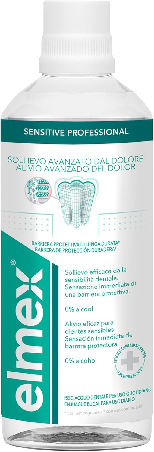 Product description elmex SENSITIVE collutorio Quando l’età avanza le gengive si ritraggono, mettendo a nudo il colletto dentale. Senza la protezione delle gengive e dello smalto, il colletto diventa suscettibile agli stimoli esterni e alla carie dentinale. Il collutorio elmex SENSITIVE contiene fluoruro amminico, una sostanza molto efficace che forma una doppia pellicola protettiva di polimero e di fluoruro amminico sui colletti dentali esposti. Sigilla i tubuli dentinali evitando così il passaggio di sensazioni spiacevoli. Allo stesso tempo il fluoruro amminico garantisce una protezione efficace dalla carie dentinale. Se usato quotidianamente il Sistema elmex SENSITIVE (dentifricio, collutorio e spazzolino) offre una maggiore efficacia. Se un albero è senza corteccia, è inesorabilmente esposto agli elementi. E’ esattamente lo stesso per i denti. Se i colletti dentali sono esposti, c’è il rischio di carie. Target Persone con colletti dentali scoperti e denti sensibili. Vantaggi principali Riduzione dell’ipersensibilità esistente. Protezione dalla carie della radice e dei denti sensibili. Uso raccomandato Sciacquare la bocca con 10 ml di collutorio puro per 30 secondi una o due volte al giorno. Contenuto in fluoruro 250 ppm Directions Rinse your mouth with 10 ml of pure mouthwash for 30 seconds, once or twice a day. P.when('A').execute(function(A) { A.on('a:expander:toggle_description:toggle:collapse', function(data) { window.scroll(0, data.expander.$expander[0].offsetTop-100); }); }); Safety Warning Do not swallow. Avoid contact with eyes. If ingested, seek medical attention immediately. See more,Other
