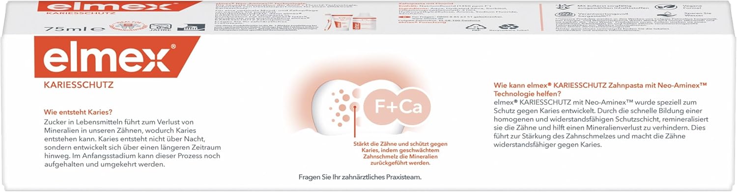 About this item Caries prevention - The amine fluoride formula of the innovative ELMEX toothpaste highly effectively strengthens the enamel and makes the teeth resistant to tooth decay Strong formula - With the dual active calcium fluoride protective shield, the toothpaste prevents mineral loss while ensuring remineralisation of teeth For caries prone teeth - For people with increased susceptibility to caries and weakened, demineralised enamel, the ELMEX caries protection dental care offers effective protection Daily use - The toothpaste is ideal for daily brushing and provides weakened teeth valuable minerals for effective caries protection - clinically confirmed Details and box contents: ELMEX caries protection toothpaste with amine fluoride formula for highly effective caries protection, medical teeth cleaning for daily use, 4 x 75 ml › See more product details,Caries prevention - The amine fluoride formula of the innovative ELMEX toothpaste highly effectively strengthens the enamel and makes the teeth resistant to tooth decay,Strong formula - With the dual active calcium fluoride protective shield, the toothpaste prevents mineral loss while ensuring remineralisation of teeth,For caries prone teeth - For people with increased susceptibility to caries and weakened, demineralised enamel, the ELMEX caries protection dental care offers effective protection,Daily use - The toothpaste is ideal for daily brushing and provides weakened teeth valuable minerals for effective caries protection - clinically confirmed,Details and box contents: ELMEX caries protection toothpaste with amine fluoride formula for highly effective caries protection, medical teeth cleaning for daily use, 4 x 75 ml