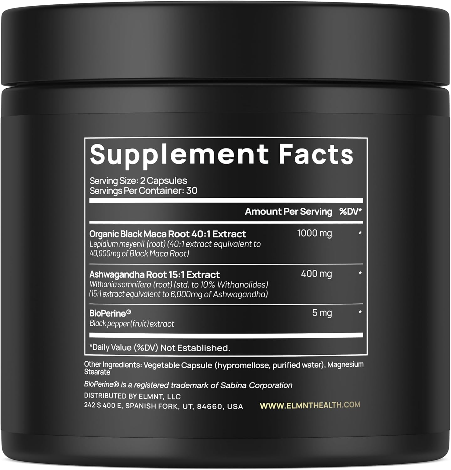 Elmnt 40,000Mg 40X Strength Organic Black Maca Root With Ashwagandha - Highest Potency Black Maca Root Capsules For Men - 100% Pure Maca Peruana Powder Organic, Gelatinized, Non-Gmo - 60 Pills