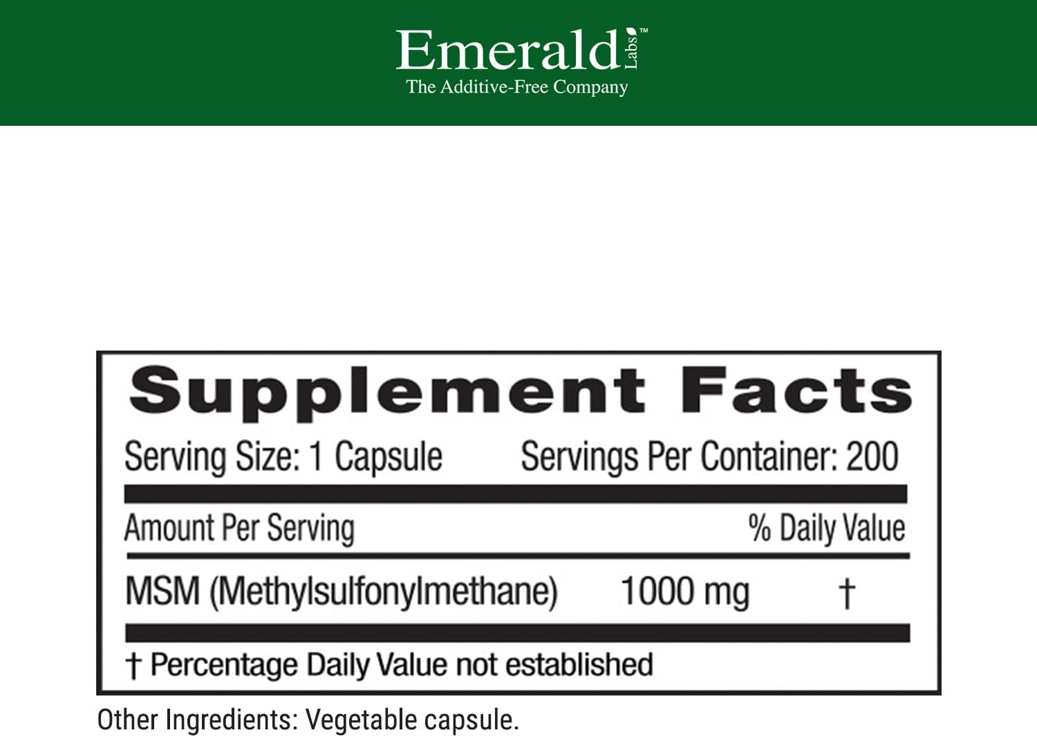 DESCRIPTION : Emerald Labs MSM 1000 mg - Dietary Supplement with Plant-Sourced Methylsulfonylmethane for Joint Support and Healthy Immune Function - 200 Vegetable Capsules