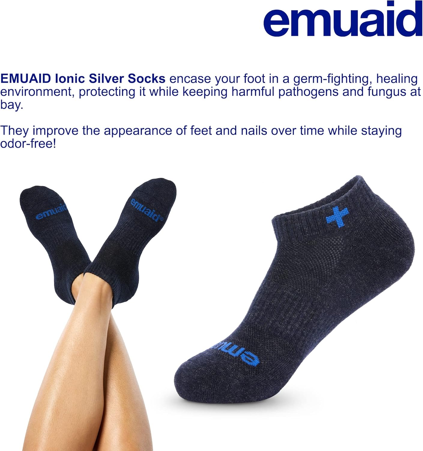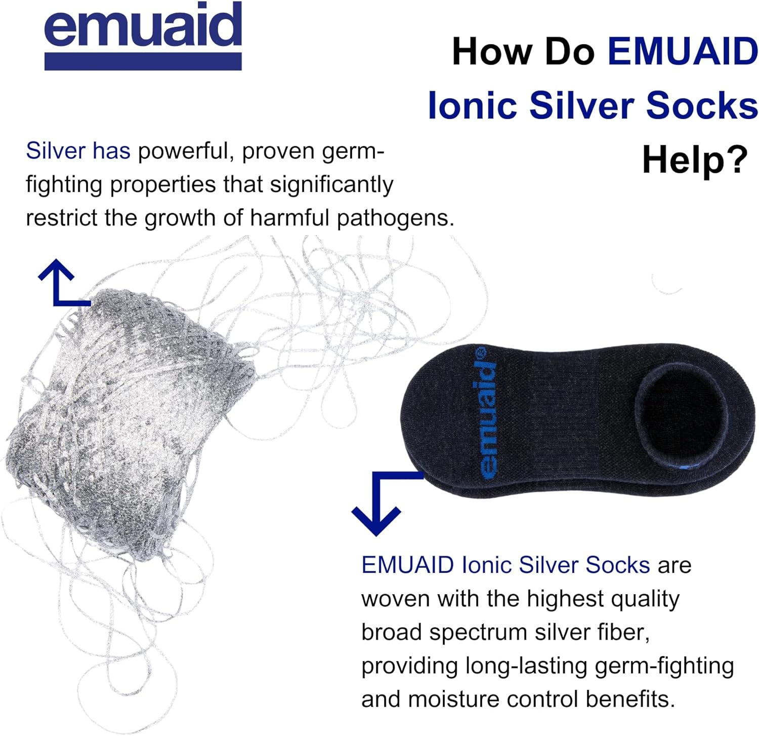 About this item EMUAID Ionic Silver Socks are made with nylon coated 99.99% pure silver fiber. Silver has odor-neutralizing and germ-combating properties, helping eliminate odors and fungal growth. The silver in the socks helps soothe inflammation and redness associated with various foot conditions. When used with EMUAIDMAX First Aid Ointment, the socks allow the ointment to work fast and effectively while creating a protective barrier. If you're suffering from corns, calluses, blisters, cracked heels, muscle weakness, or pain in your feet, these socks help to reduce discomfort while ensuring your feet stay dry and odor-free during your outdoor walks and hikes. They are also comfortable to wear around the house or to sleep, especially when it gets cold at night! See more product details,EMUAID Ionic Silver Socks are made with nylon coated 99.99% pure silver fiber. Silver has odor-neutralizing and germ-combating properties, helping eliminate odors and fungal growth,The silver in the socks helps soothe inflammation and redness associated with various foot conditions,When used with EMUAIDMAX First Aid Ointment, the socks allow the ointment to work fast and effectively while creating a protective barrier,If you're suffering from corns, calluses, blisters, cracked heels, muscle weakness, or pain in your feet, these socks help to reduce discomfort while ensuring your feet stay dry and odor-free during your outdoor walks and hikes,They are also comfortable to wear around the house or to sleep, especially when it gets cold at night!