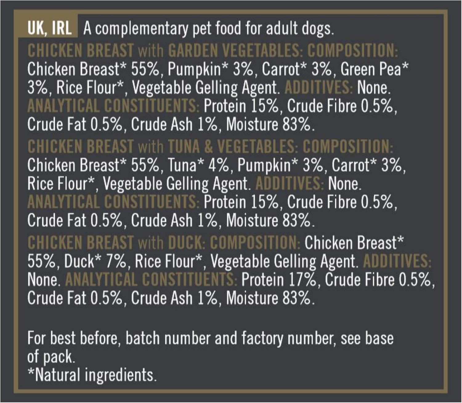 Pack contains 5 Pouches x 100g Finest Chicken Selection. Chicken Breast with Vegetables, Chicken with Duck, Chicken with Tuna