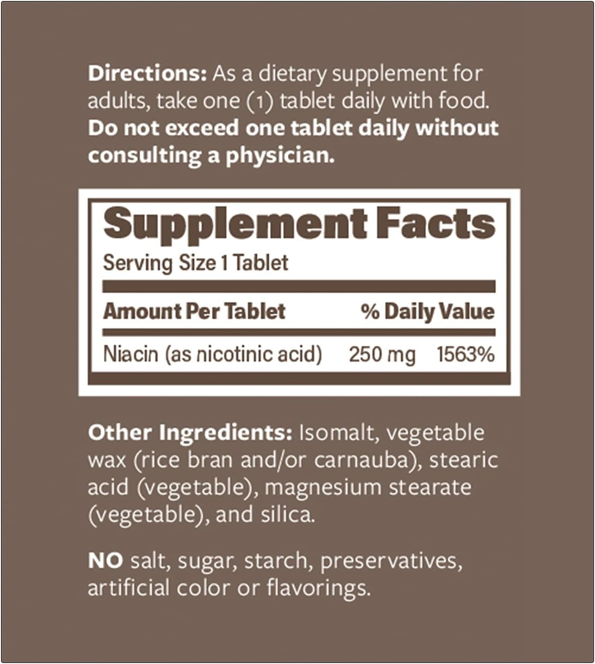 EACH SERVING CONTAINS 250mg of immediate-release nicotinic acid (crystalline niacin, vitamin B-3) with our proprietary vegetable-based wax matrix tablet core that slows delivery