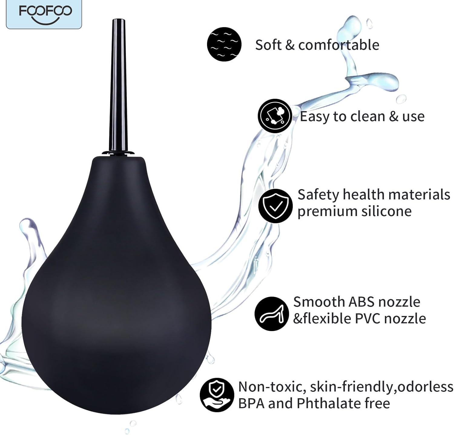 NON-TOXIC AND HARMLESS- The enema flusher helps relieve constipation, faecal impaction and cleanses the intestinal tract, keeping your intestines clean and healthy10HIGH QUALITY- The enema ball is made of high quality silicone and offers 4 different types of nozzles for your choice. 3 soft nozzles and 1 hard plastic nozzle, for anal and vaginal cleansing10COMPACT SIZE- The enema ball has a capacity of 7.6 ounces with a 19.7 inch silicone hose with a black storage bag10EASY TO USE- The enema ball kit is soft, strong and flexible. Perfect for both men and women10EASY TO CLEAN- Separate the enema nozzle from the douche, rinse with warm water or soap and dry with a clean cloth