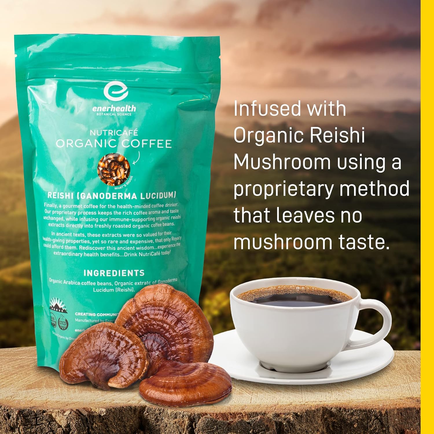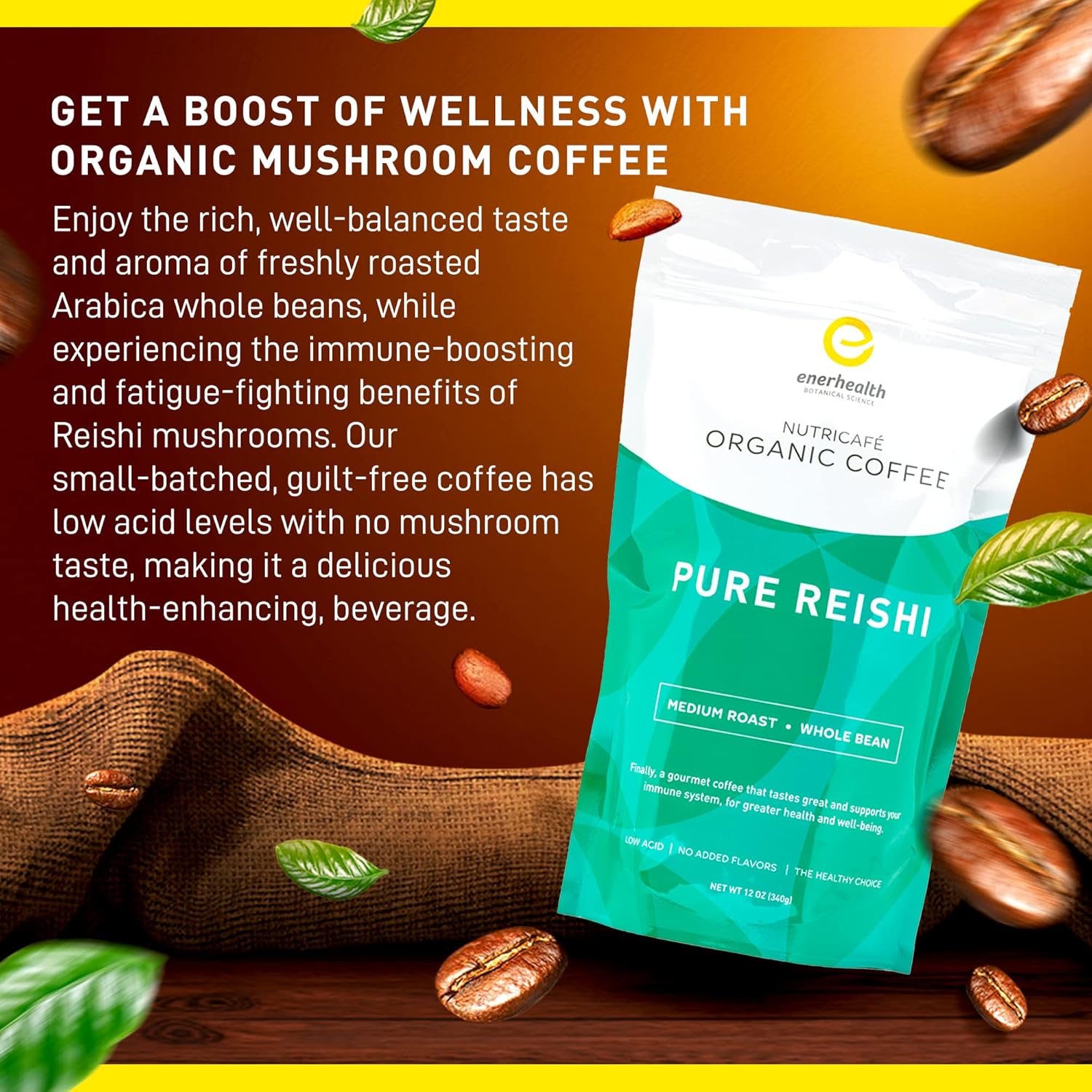 Enerhealth Botanicals Nutricafé Pure Reishi – Fairly Traded, Low Acid, Medium Roast Whole Arabica Bean Coffee, Infused With Organic Mushroom Extracts To Boost Immunity & Fight Fatigue – 12 Oz