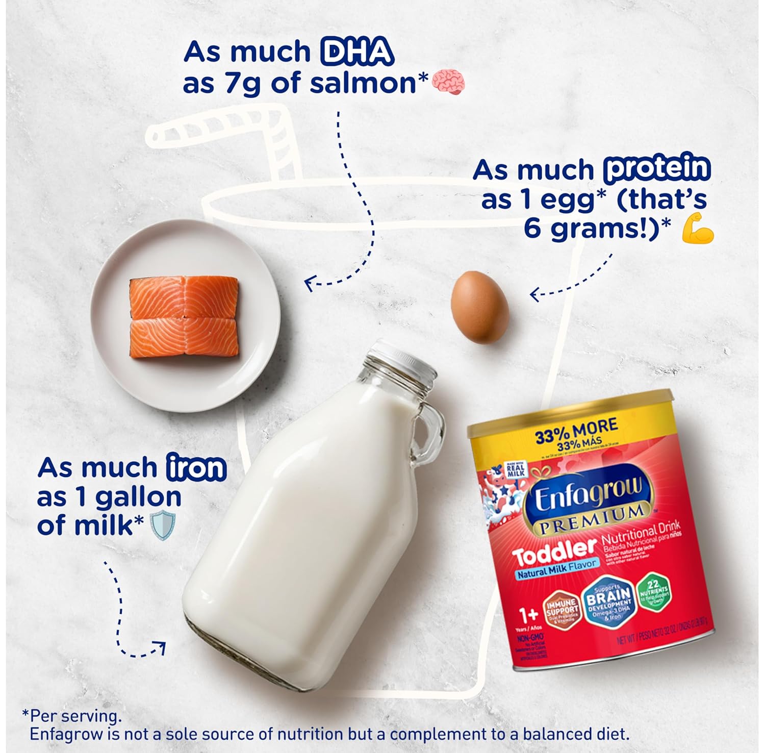 About this item It is made with real milk and has as much protein as one large egg, as much iron as 1 gallon of milk, and as much DHA as 7g of Salmon (per serving). It has 22 vitamins and minerals, brain building DHA, prebiotics, basically a nutritional support system for your lil independent toddler A picky phase doesn't mean missing out on nutrients - Enfagrow can provide peace of mind to parents that they’re supporting their toddler's development READY IN SECONDS SNAP ELIGIBLE: Eligible to be purchased with Supplemental Nutrition Assistance Program (SNAP) benefits See more product details,It is made with real milk and has as much protein as one large egg, as much iron as 1 gallon of milk, and as much DHA as 7g of Salmon (per serving),It has 22 vitamins and minerals, brain building DHA, prebiotics, basically a nutritional support system for your lil independent toddler,A picky phase doesn't mean missing out on nutrients - Enfagrow can provide peace of mind to parents that they’re supporting their toddler's development,READY IN SECONDS,SNAP ELIGIBLE: Eligible to be purchased with Supplemental Nutrition Assistance Program (SNAP) benefits