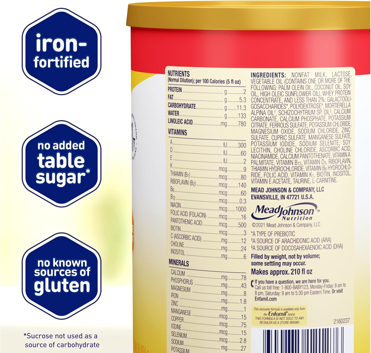 About this item NURTURING BRAIN DEVELOPMENT: Our formula has expert-recommended DHA & choline, known to support your baby's growing brain, supporting their milestones. IMMUNE SUPPORTING NUTRIENTS: Enfamil Infant is iron-fortified and has a dual-prebiotic blend to support your baby's immune system. NUTRITION DESIGNED FOR YOUR INFANT: Designed with care for babies up to 12 months with vitamins & minerals that support their overall health. TRUSTED INGREDIENTS: Enfamil Infant Formula is has no added table sugar* and no known sources of gluten. TRUSTED BY PARENTS & PEDIATRICIANS*: Enfamil is the #1 Trusted Infant Formula Brand by Pediatricians* & Parents and the #1 Trusted Brand for Brain-Building & Immune Support. SNAP ELIGIBLE: Eligible to be purchased with Supplemental Nutrition Assistance Program (SNAP) benefits. SUBSCRIBE & SAVE: Choose Subscribe and Save for additional savings and convenience. See more product details,NURTURING BRAIN DEVELOPMENT: Our formula has expert-recommended DHA & choline, known to support your baby's growing brain, supporting their milestones,IMMUNE SUPPORTING NUTRIENTS: Enfamil Infant is iron-fortified and has a dual-prebiotic blend to support your baby's immune system,NUTRITION DESIGNED FOR YOUR INFANT: Designed with care for babies up to 12 months with vitamins & minerals that support their overall health,TRUSTED INGREDIENTS: Enfamil Infant Formula is has no added table sugar* and no known sources of gluten,TRUSTED BY PARENTS & PEDIATRICIANS*: Enfamil is the #1 Trusted Infant Formula Brand by Pediatricians* & Parents and the #1 Trusted Brand for Brain-Building & Immune Support,SNAP ELIGIBLE: Eligible to be purchased with Supplemental Nutrition Assistance Program (SNAP) benefits,SUBSCRIBE & SAVE: Choose Subscribe and Save for additional savings and convenience