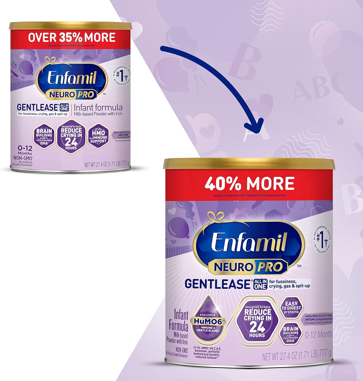 ALL-IN-ONE COMFORT FOR YOUR LITTLE ONE: Enfamil NeuroPro Gentlease is thoughtfully crafted to provide all-in-one comfort, designed to ease fussiness, crying, gas, and spit-up within just 24-hours, so you and your baby can enjoy precious moments of peace10PATENTED PREBIOTIC FIBER BLEND: Enfamil NeuroPro Gentlease has PDX and GOS prebiotics to help ease stooling discomfort and promotes healthy, frequent stooling10NURTURING BRAIN DEVELOPMENT: Our formula has expert-recommended DHA, known to support your baby's growing brain, supporting their milestones with confidence10HuMO6 GENTLE + IMMUNE BLEND§: Enfamil NeuroPro Gentlease features our exclusive HuMO6 gentle + immune blend, to support your baby's immune system, because your baby's well-being is our top priority10NUTRITION DESIGNED FOR YOUR INFANT: Designed with care for babies up to 12 months, Enfamil formula includes easy-to-digest proteins, vitamins & minerals