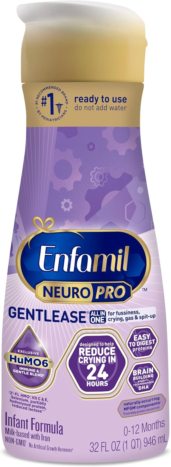 Introducing Enfamil NeuroPro Gentlease. Our trusted Gentlease baby formula, clinically proven to reduce fussiness, colic, baby gas, and crying within 24 hours, now has MFGM that provides brain support first. Emerging evidence from a recent clinical study showed MFGM in baby formula supports cognitive development similar to breast milk.* NeuroPro is the only infant formula that has a fat-protein blend of MFGM & Omega 3 DHA, previously only found in breast milk.ā So you can get nutrition for brain support inspired by breast milk from the baby formula brand that's #1 recommended by Pediatricians**. It offers complete nutrition for babies through 12 months with Omega 3 DHA and Choline, important nutrients for brain support, easy-to-digest proteins, and baby probiotics for immune support. *As measured by Bayley-III cognitive score at 12 months in a different formula with MFGM added as an ingredient. **QuintilesIMS, using the ProVoice Survey fielded from Janurary 2017 to December 31, 2017. ā In amounts supported by clinical research. ā”Not made with genetically modified ingredients, but trace amounts of genetically engineered materials may be present in the product from manufacturing environments and process sourcesREADY TO USE: Convenient and ready to use bottles, perfect for on-the-go momsALL-IN-ONE COMFORT FOR YOUR LITTLE ONE: Enfamil NeuroPro Gentlease is thoughtfully crafted to provide all-in-one comfort, designed to ease fussiness, crying, gas, and spit-up within just 24-hours, so you and your baby can enjoy precious moments of peace NURTURING BRAIN DEVELOPMENT: Our formula has expert-recommended DHA, known to support your baby's growing brain, supporting their milestones with confidence HuMO6 GENTLE + IMMUNE BLEND§: Enfamil NeuroPro Gentlease features our exclusive HuMO6 gentle + immune blend, to support your baby's immune system, because your baby's well-being is our top priority