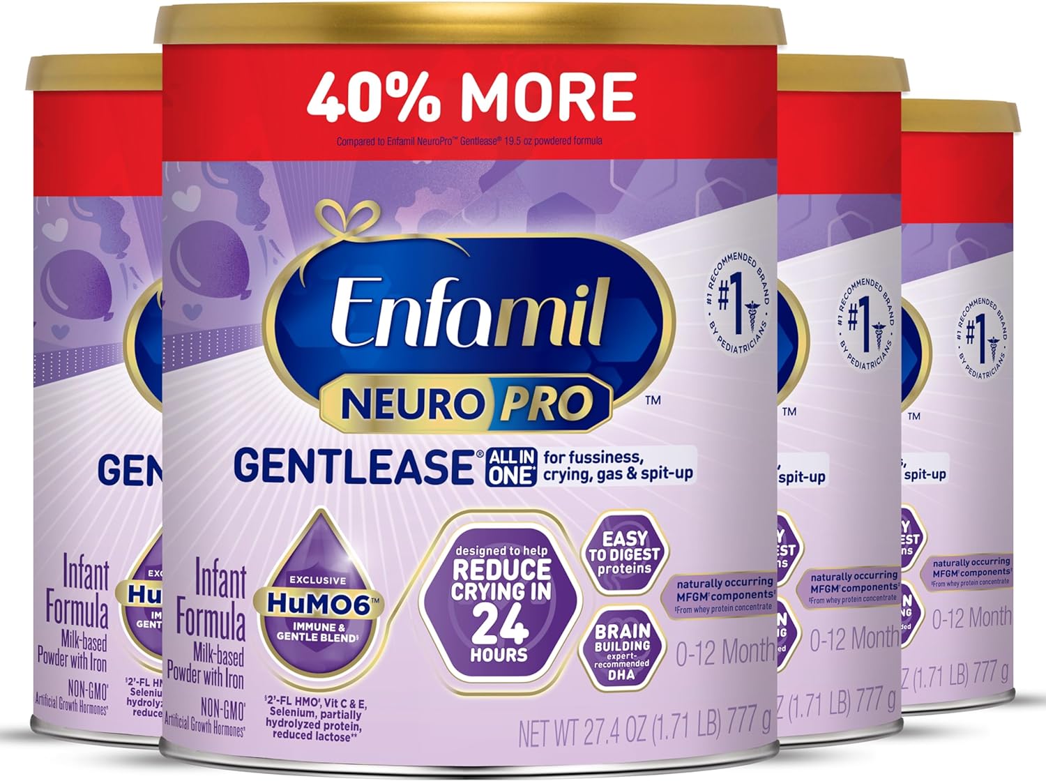 Enfamil NeuroPro Gentlease Baby Formula, Infant Formula Nutrition, Brain Support that has DHA, HuMO6 Immune Blend, Designed to Reduce Fussiness, Crying, Gas & Spit-up in 24 Hrs, 27.4 Oz, 4 Cans