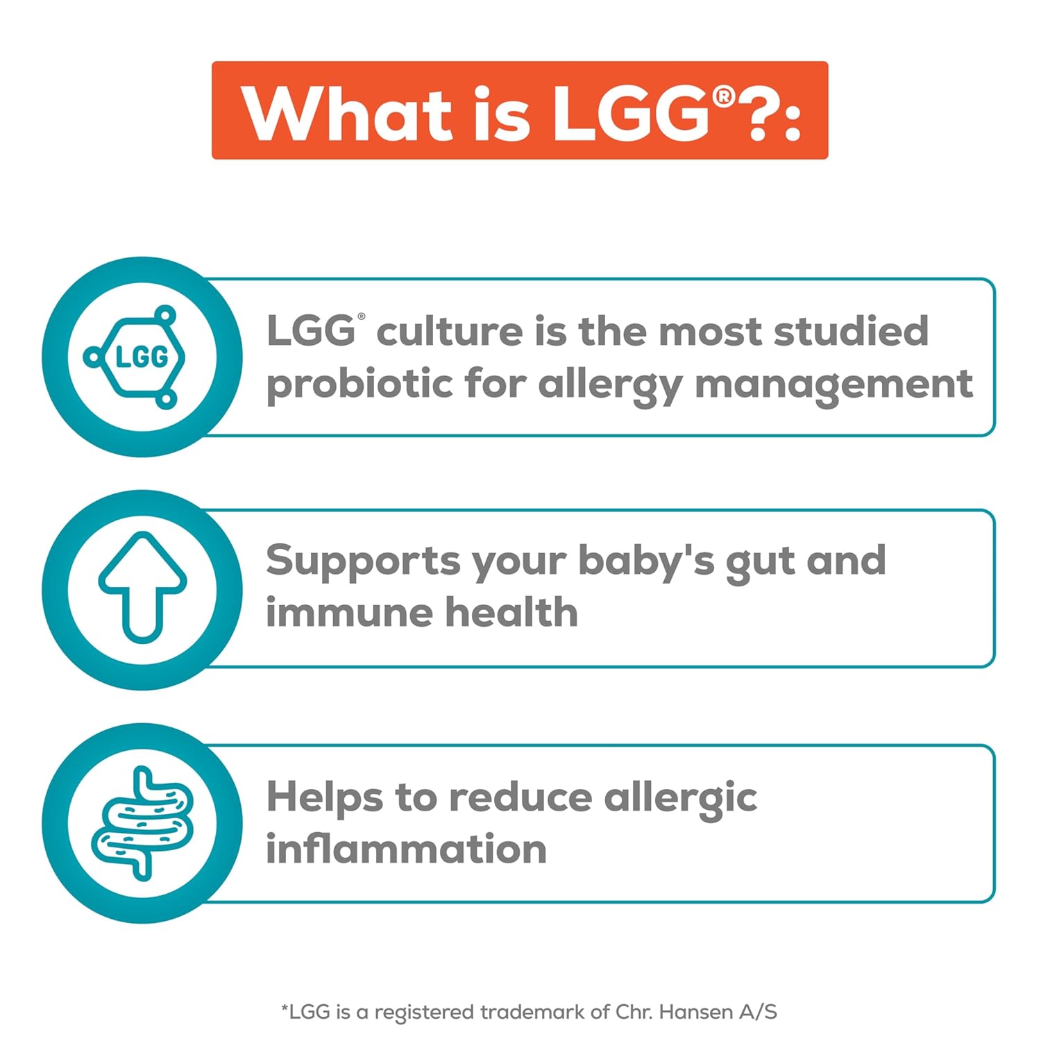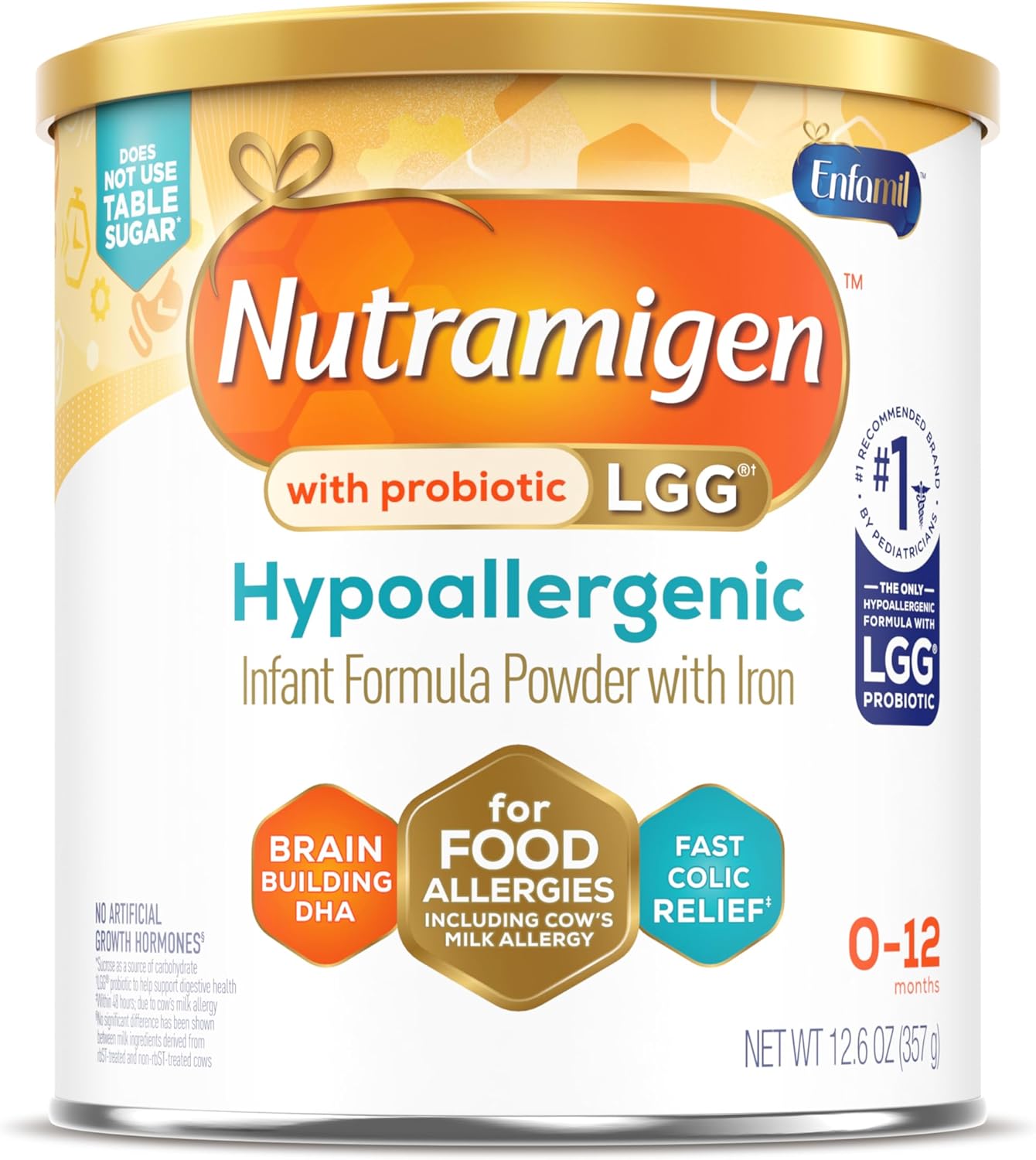 Nutramigen with Enflora LGG* is a proven hypoallergenic infant formula specially designed to manage colic due to cow's milk protein allergy. With the Power of Two, an extensively hydrolyzed protein to reduce babies' allergen exposure and the probiotic LGG to help the strength of their intestinal barrier, Nutramigen helps support infants with normal growth and development. Nutramigen is proven*** to manage colic due to cow's milk protein allergy FAST--often within 48 hours. For babies with allergies to the cow's milk protein found in regular infant formula, Nutramigen is a trusted and nutritionally balanced alternative for a baby's first 12 months.