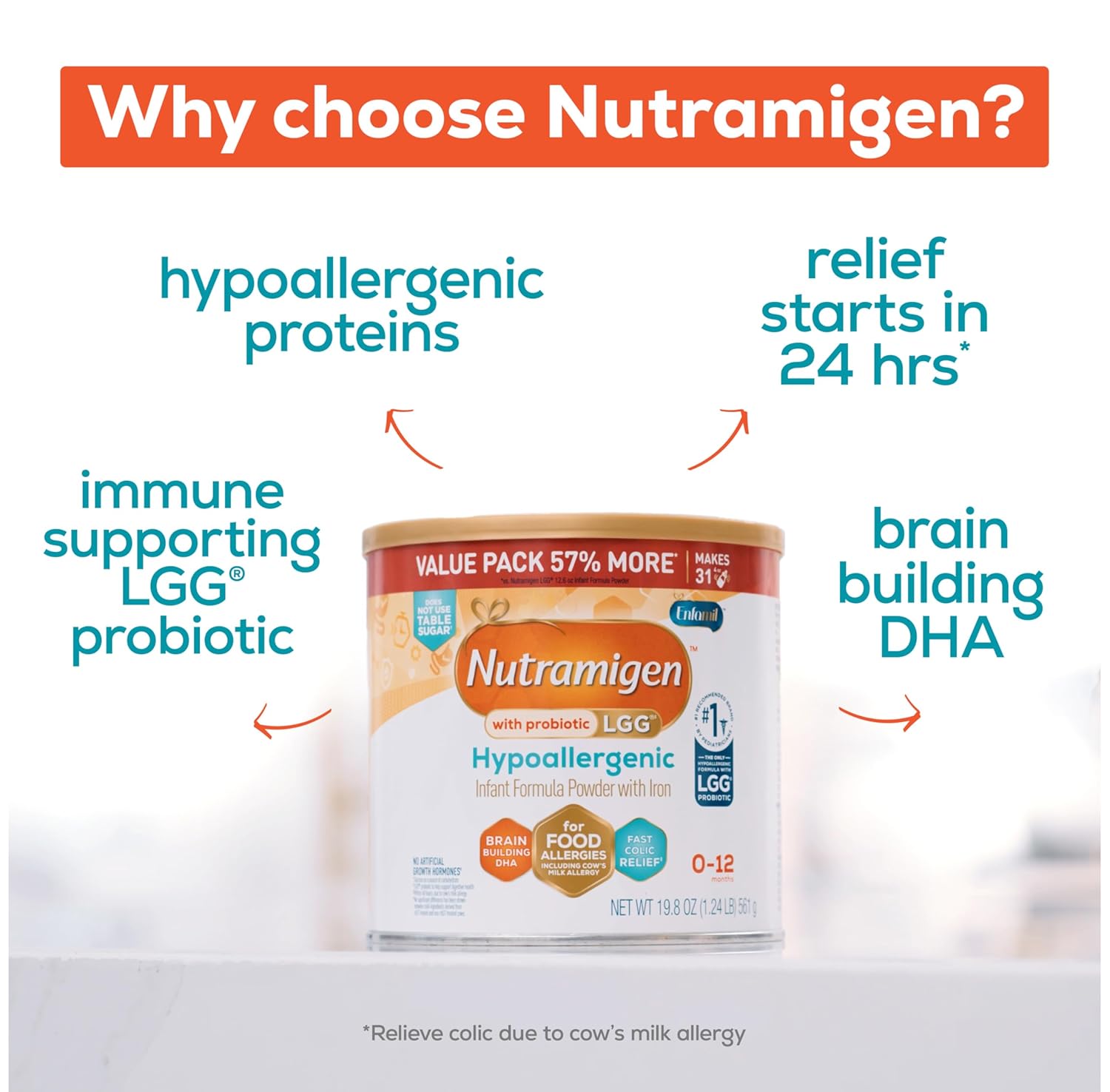 About this item HELPS TO EASE COLIC: Delivers Clinically-Proven Relief when managing colic due to cow’s milk allergy for a happier, better-rested baby & mom FAST RELIEF NOW: As early as the first feeding, with 90% of infants improving within 48 hours INCLUDES LGG: The most extensively studied probiotic for allergy management and supporting the digestive health of your baby BRAIN SUPPORT: Nutramigen is a gentle, lactose free baby formula that has important nutrients found in breast milk such as Omega-3 DHA, ARA, and Choline that provide brain support IMMUNE SUPPORT: Helps support baby's immune system to return to consuming traditional milk protein formula without an allergic response SNAP ELIGIBLE: Eligible to be purchased with Supplemental Nutrition Assistance Program (SNAP) benefits SUBSCRIBE & SAVE: Choose Subscribe and Save for additional savings and convenience See more product details,HELPS TO EASE COLIC: Delivers Clinically-Proven Relief when managing colic due to cow’s milk allergy for a happier, better-rested baby & mom,FAST RELIEF NOW: As early as the first feeding, with 90% of infants improving within 48 hours,INCLUDES LGG: The most extensively studied probiotic for allergy management and supporting the digestive health of your baby,BRAIN SUPPORT: Nutramigen is a gentle, lactose free baby formula that has important nutrients found in breast milk such as Omega-3 DHA, ARA, and Choline that provide brain support,IMMUNE SUPPORT: Helps support baby's immune system to return to consuming traditional milk protein formula without an allergic response,SNAP ELIGIBLE: Eligible to be purchased with Supplemental Nutrition Assistance Program (SNAP) benefits,SUBSCRIBE & SAVE: Choose Subscribe and Save for additional savings and convenience
