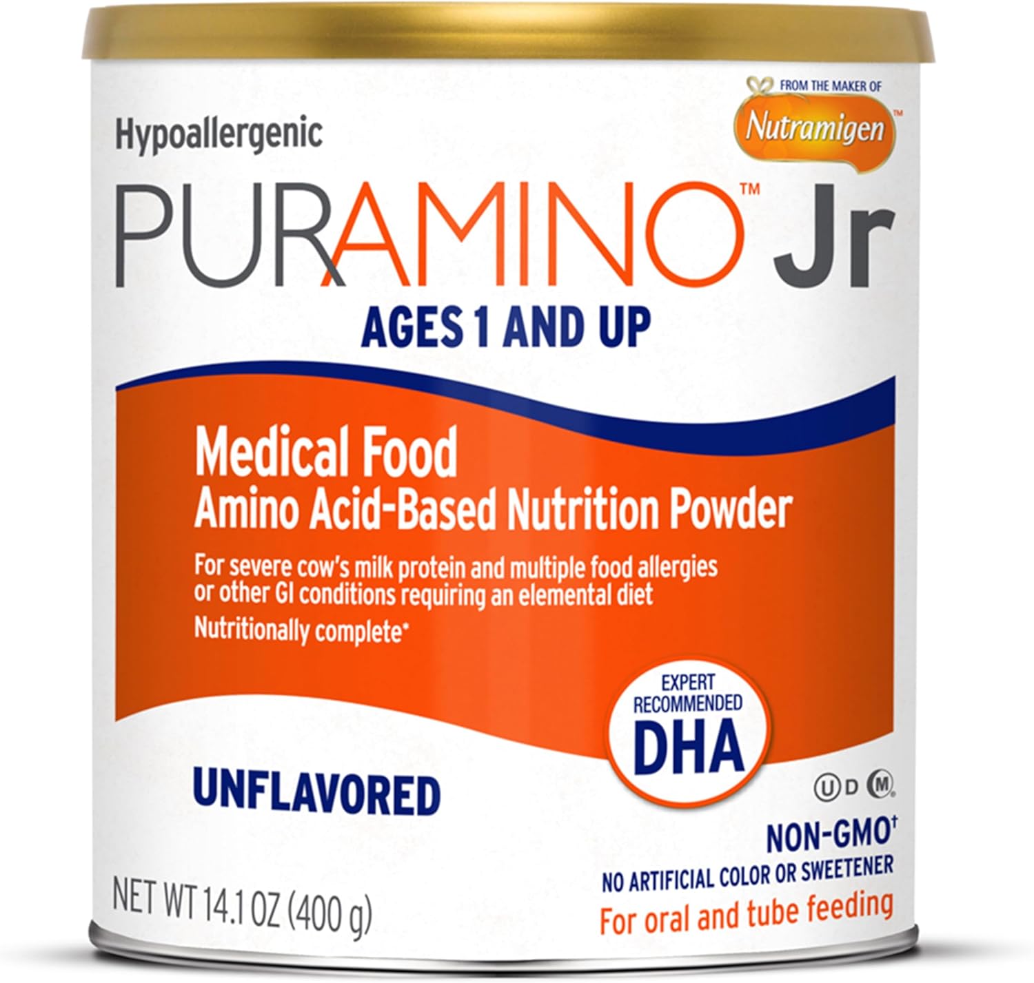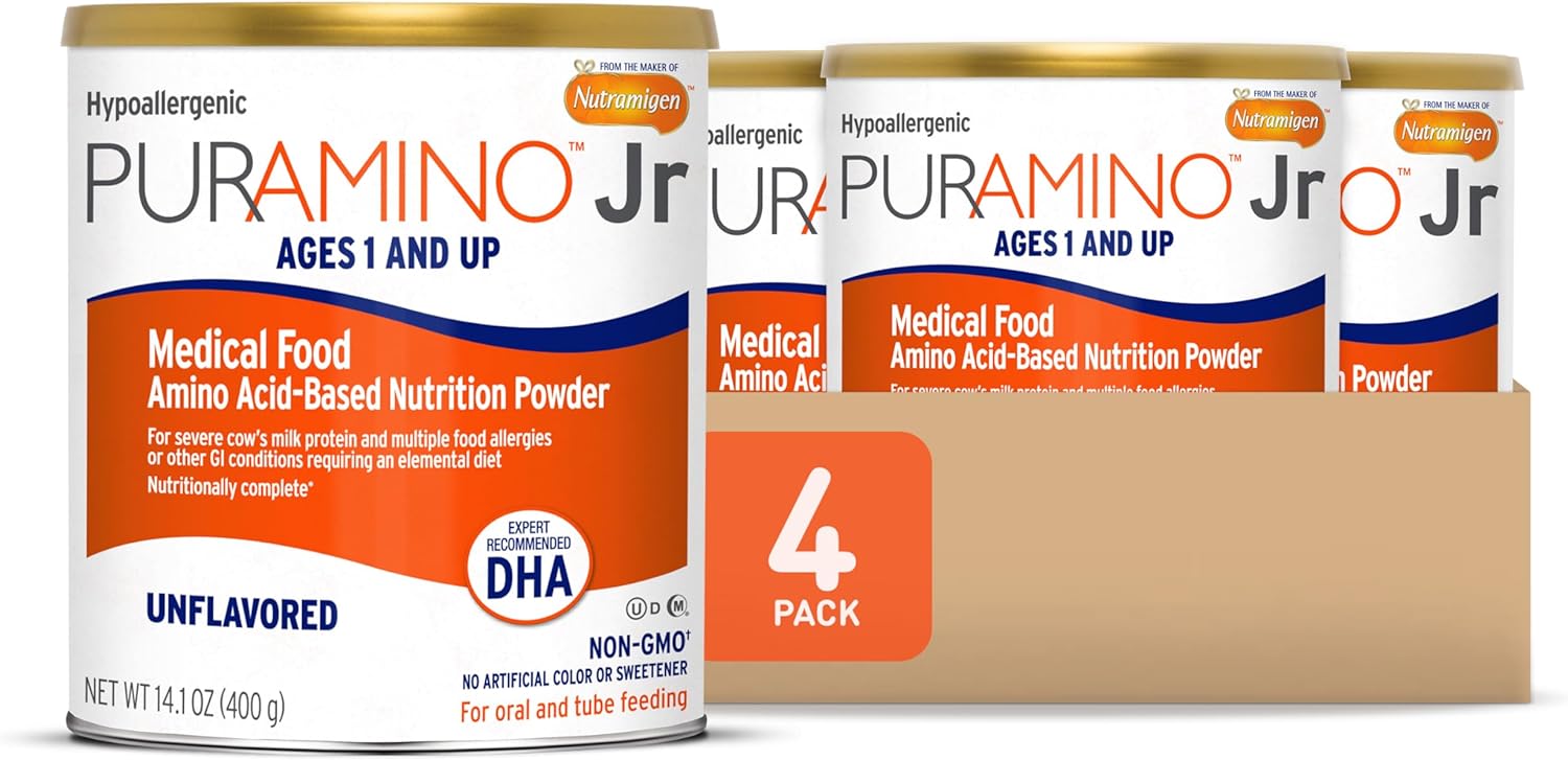 SUITABLE FOR TUBE FEEDING: Puramino Junior is appropriate for both oral and tube feeding10FOR SEVERE FOOD ALLERGIES: PurAmino Junior is a hypoallergenic, iron-fortified, and amino acid-based formula for the dietary management of toddlers with severe cow's milk protein & multiple food allergies10NUTRITIONALLY COMPLETE FORMULA: For toddlers and children ages 1 and up with DHA and ARA, nutrients also found in breast milk that promotes brain and eye development10HYPOALLERGENIC: 100% Amino-Acid based, iron-fortified formula, suitable for toddlers and children with lactose intolerance10EXPERT RECOMMENDED DHA: PurAmino has expert recommended DHA which provides brain-building nutrition