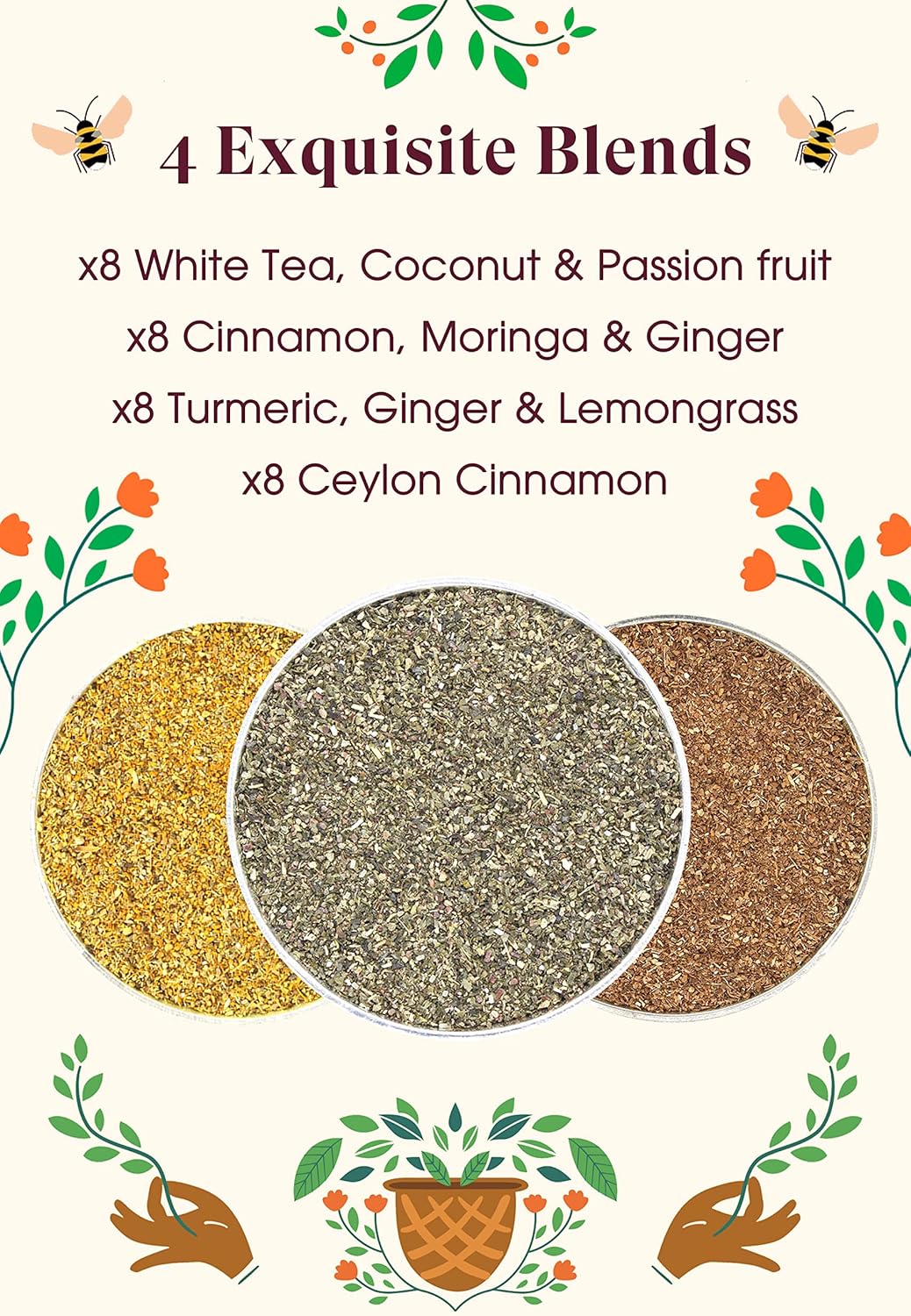 Ingredients: "English Breakfast - Organic Black Tea. Ingredients: Organic black tea* (100%). * Traded in compliance with Fairtrade Standards." "Earl Grey - Organic Black Tea with Bergamot. Ingredients: Organic Ceylon black tea* (95%), organic bergamot oil (5%). * Traded in compliance with Fairtrade Standards." "Chamomile Lavender - Organic Herbal Tea with Chamomile and Lavender. Ingredients: Organic chamomile (70%), organic lavender (30%)." "Lemongrass, Citrus & Ginger - Organic Herbal Tea with Lemongrass, Citrus and Ginger. Ingredients: Organic lemongrass (49%), organic orange peels (24%), organic ginger (22%), organic lime oil (2.5%), organic mandarin oil (2.5%)." "Super Berries - Organic Hibiscus Herbal Tea with Rooibos, Strawberries, Blueberries and Raspberries. Ingredients: Organic hibiscus (63%), organic rooibos (19%), natural flavourings (5%), organic spearmint (4%), organic raspberries (3%), organic strawberries (3%), organic blueberries (3%). " "White Tea, Coconut & Passion Fruit - Organic White Tea with Lemongrass, Cocoa, Ginger, Passion Fruit & Coconut. Ingredients: Organic white tea (63.5%), organic lemongrass (14%), organic cocoa (8%), organic ginger (6%), natural flavourings (5%), organic passion fruit flower (3%), organic coconut (0.5%)." "Chocolate, Rooibos & Vanilla - Organic Rooibos Herbal Tea, Cocoa nibs and Vanilla pods. Ingredients: Organic rooibos (88.5%), organic cocoa nibs (6%), natural flavourings (5%), organic vanilla pods (0.5%). " "Energise Me - Organic Herbal Tea with Spearmint, Peppermint, Blackberry and Ginseng. Ingredients: Organic spearmint (34%), organic peppermint (20%), organic blackberry leaves (12%), organic rooibos (7%), organic nettle leaves (7%), organic ginger roots (6%), organic lemongrass (5%), organic cinnamon (5%), organic elderflower (2%), organic ginseng (2%)." Turmeric (Curcuma), Ginger & Lemongrass - Organic Herbal Tea with Ginger, Turmeric, Lemongrass, Licorice, Cloves, Lemon, Cardamom, Pepper and Cumin Seeds. Ingredients: Organic ginger (30%), organic turmeric (30%), organic lemongrass (14%), organic licorice (7%), organic cloves (6%), organic lemon peels (4%), organic cardamom (4%), organic black pepper (3%), organic cumin seeds (2%). âContains licorice - people suffering from hypertension should avoid excessive consumptionâ