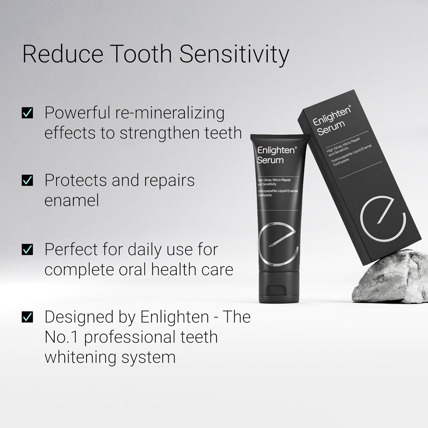 About this item Toothpaste for Sensitive Teeth: Formulated to provide effective daily cleaning, it fights tooth decay, gingivitis, tartar and plaque, while helping to regenerate and repair enamel. Advanced Enamel Repair: With its active ingredient, hydroxyapatite, the toothpaste helps repair enamel wear and erosion, reducing sensitivity and improving tooth strength. How it works: Daily use of the Enlighten Serum polishes your smile while also allowing the hydroxyapatite to restore micro-damage. It strengthens the enamel, effectively reducing teeth sensitivity. Safe for Daily Use: Ideal for a healthy smile and fresh mouth, it can be used twice a day, morning and evening with any toothbrush Safe and Reliable: Recommended by top cosmetic dentists, vegan, gluten-free and sugar-free, no animal testing and formulated with 1305 ppm fluoride for optimal protection. › See more product details,Toothpaste for Sensitive Teeth: Formulated to provide effective daily cleaning, it fights tooth decay, gingivitis, tartar and plaque, while helping to regenerate and repair enamel,Advanced Enamel Repair: With its active ingredient, hydroxyapatite, the toothpaste helps repair enamel wear and erosion, reducing sensitivity and improving tooth strength,How it works: Daily use of the Enlighten Serum polishes your smile while also allowing the hydroxyapatite to restore micro-damage. It strengthens the enamel, effectively reducing teeth sensitivity,Safe for Daily Use: Ideal for a healthy smile and fresh mouth, it can be used twice a day, morning and evening with any toothbrush,Safe and Reliable: Recommended by top cosmetic dentists, vegan, gluten-free and sugar-free, no animal testing and formulated with 1305 ppm fluoride for optimal protection
