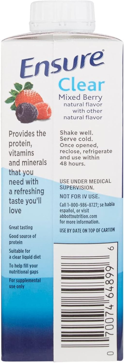 Ensure Clear. New 8Oz Re-Closeable Bottle Ensure Clear Is A Great-Tasting, Clear Liquid Nutrition Drink That Contains High-Quality Protein And Essential Nutrients. Ensure Clear Is Fat-Free, Making It An Ideal Choice For Patients On Clear-Liquid, Pre- And Post-Surgical, Bowel Prep, Fat-Malabsorptive, And Fat-Restricted Diets. It Is Also Ideal For Patients Who Prefer A Fruit-Flavored Alternative To Creamy Shake-Like Supplements. Can Benefit Patients Who Have Malnutrition, Are At Nutritional Risk, Or Are Experiencing Involuntary Weight Loss. For Oral Use. Good Source Of High Quality Protein (7 G/Serving). Clear Liquid Nutrition. Good Source Of 19 Essential Vitamins And Minerals. Refreshing Fruit Flavors Provide Taste Alternative. Contains No Fruit Juice. Kosher. Halal. Gluten-Free. Low-Residue. Suitable For Lactose Intolerance. Precautions: Not For Sole-Source Nutrition. Not For Parenteral Use. Not For People With Galactosemia