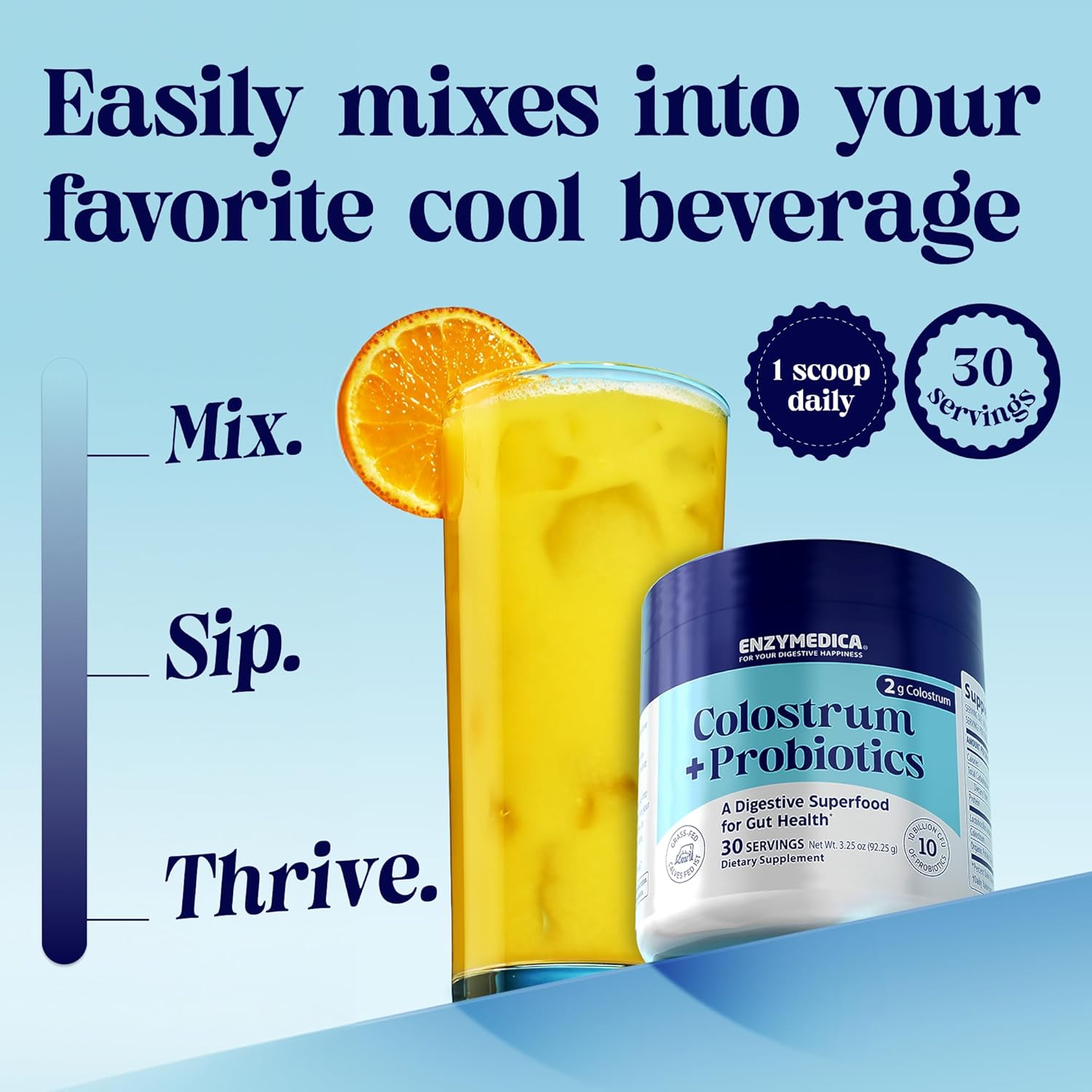 Enzymedica, Colostrum, Powder With Probiotics, Colostrum For Women, 2G, Bovine Colostrum, + 10 Billion Cfu, Grass-Fed, Gut & Immune Support, Colostrum Supplement, 30 Servings