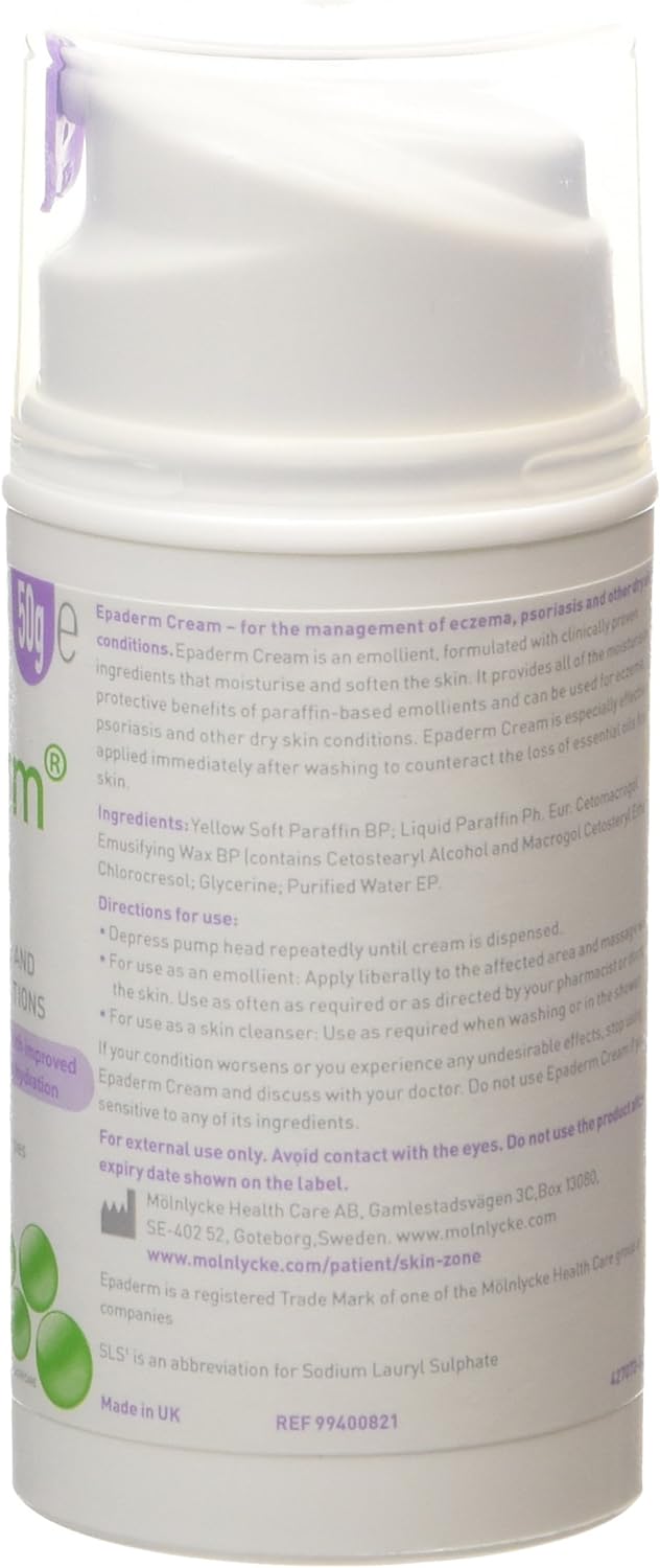 ABOUT THE PRODUCT: 1 > Epaderm Cream 50g is a 3-in-1 emollient, bath additive, and soap substitute, providing complete skin care for dry skin conditions 2 > It is free from fragrances, colorings, and SLS, making it gentle on the skin and reducing the risk of allergic reactions 3 > The cream is quickly absorbed by the skin, leaving it feeling soft and hydrated, with a protective barrier against further moisture lossEpaderm Cream is the perfect solution for anyone dealing with dry, itchy, or sensitive skin. This 50g tube of cream is specially formulated with a unique blend of emollients and moisturizers that help to soothe and protect the skin, providing long-lasting relief from discomfort and irritation. The non-greasy formula is free from fragrances, colorings, and other irritants, making it safe and gentle for use on even the most sensitive skin. The cream is suitable for use all over the body, including the face, hands, and feet, making it a versatile and convenient option for anyone dealing with skin issues. Epaderm is a trusted brand that has been providing high-quality skincare products for over 20 years, so you can be confident that you're getting a product that delivers great results
